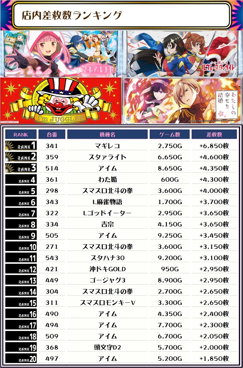 最後に、この日の店内差枚ランキングをご覧ください❗️