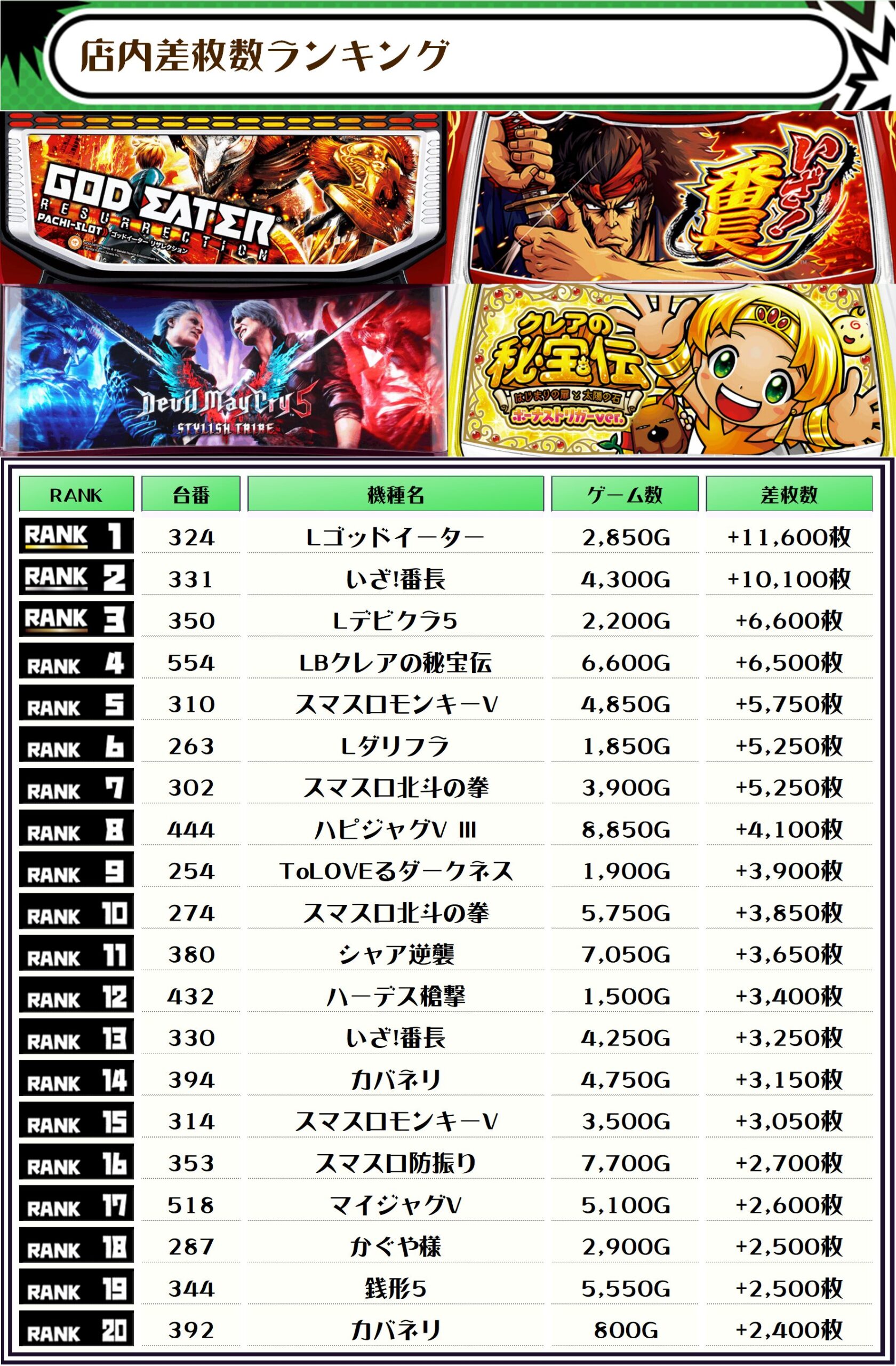 最後に、この日の店内差枚ランキングをご覧ください❗️