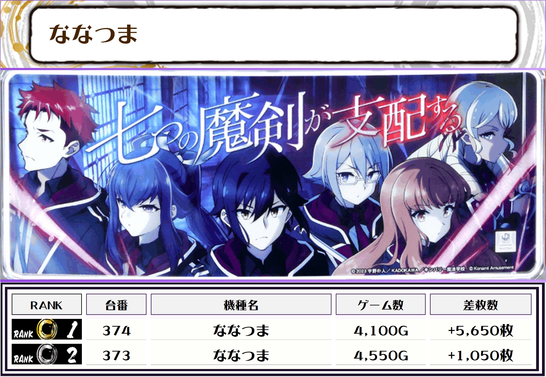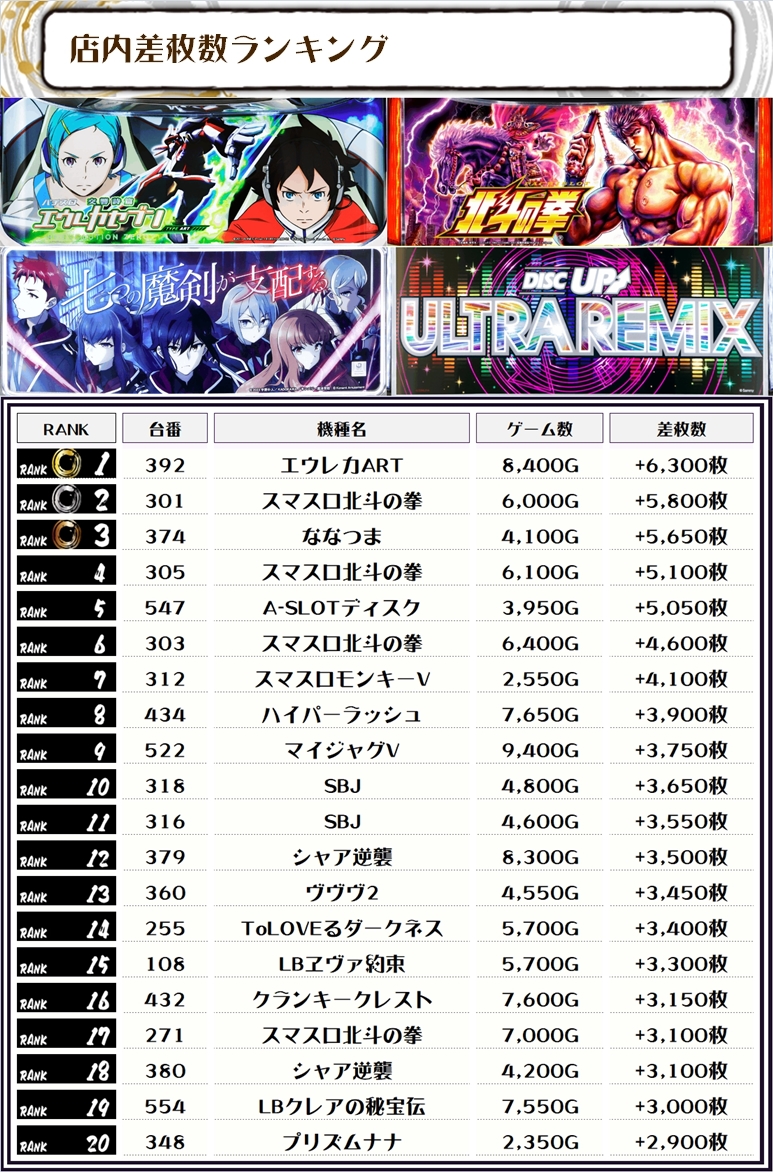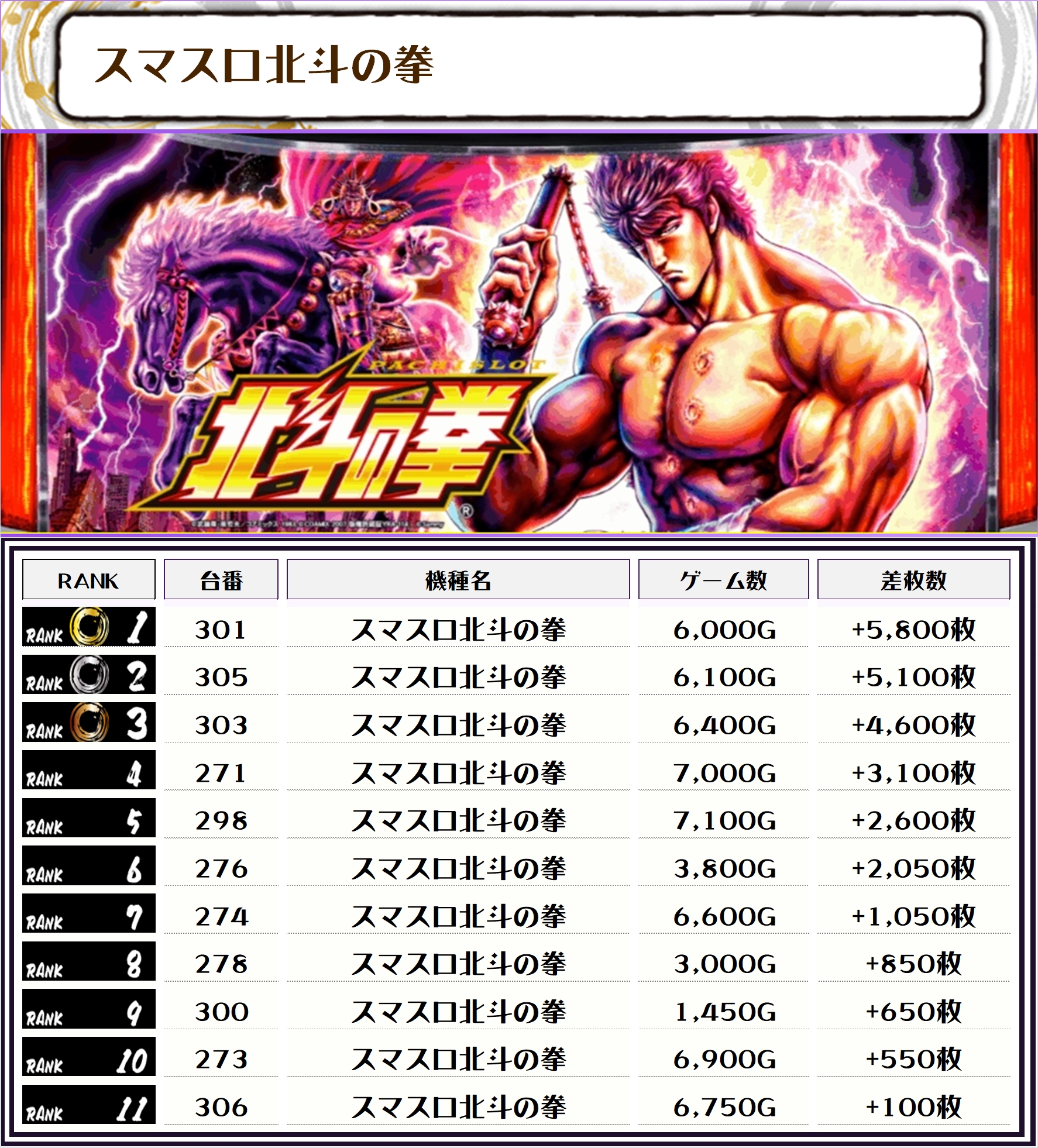続く2位には【スマスロ北斗の拳・301番台】の+5,800枚、そして3位には【ななつま・374番台】の+5,650枚がランクインですっ🏆🏆🏆🏆