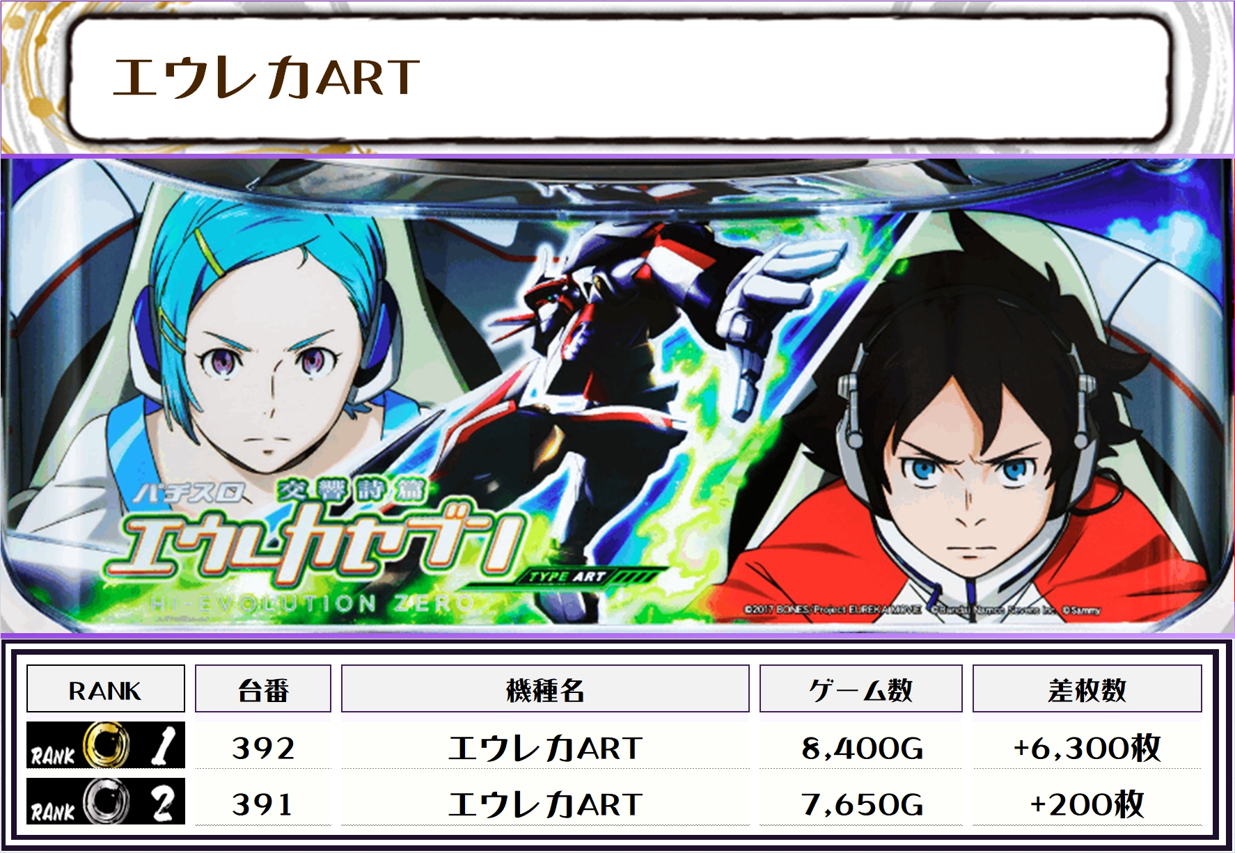 この日、全体の差枚トップに輝いたのは【エウレカART・392番台】で+6,300枚‼️