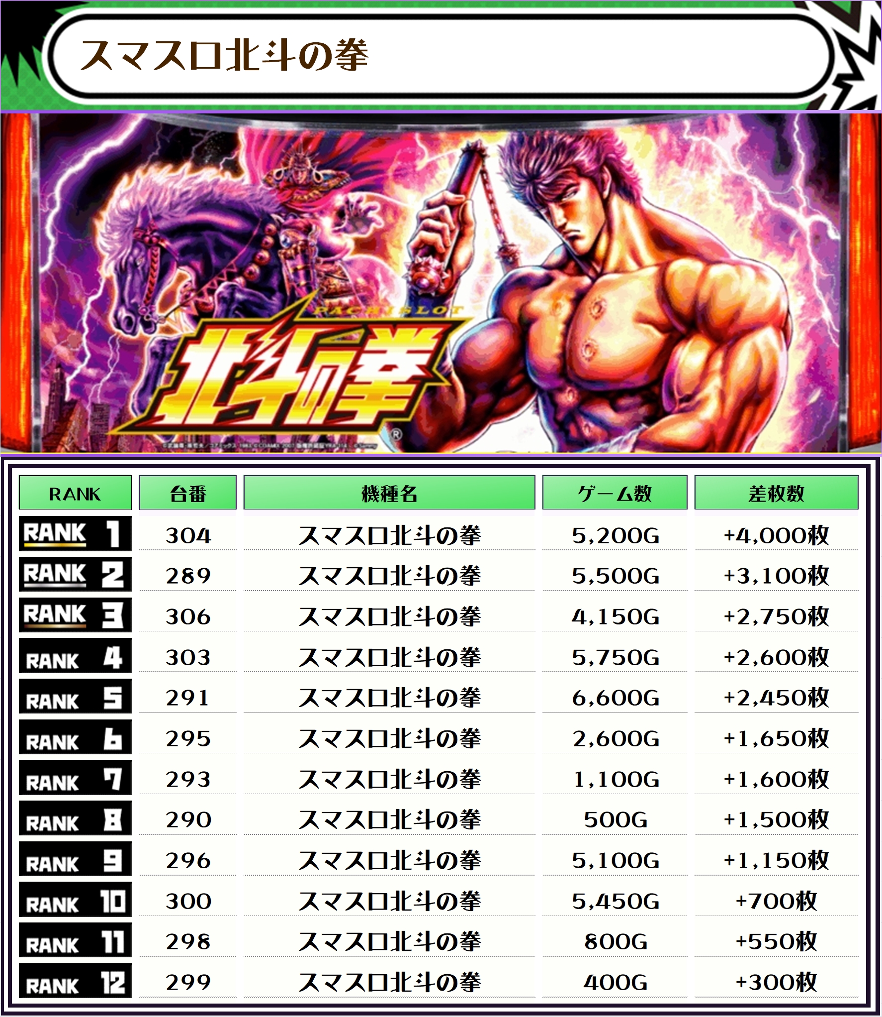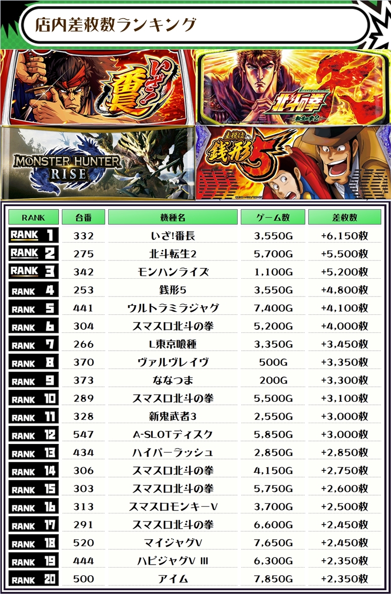 続く2位には【北斗転生2・275番台】の+5,500枚、そして3位には【モンハンライズ・342番台】の+5,200枚がランクインっ🏆🏆🏆🏆