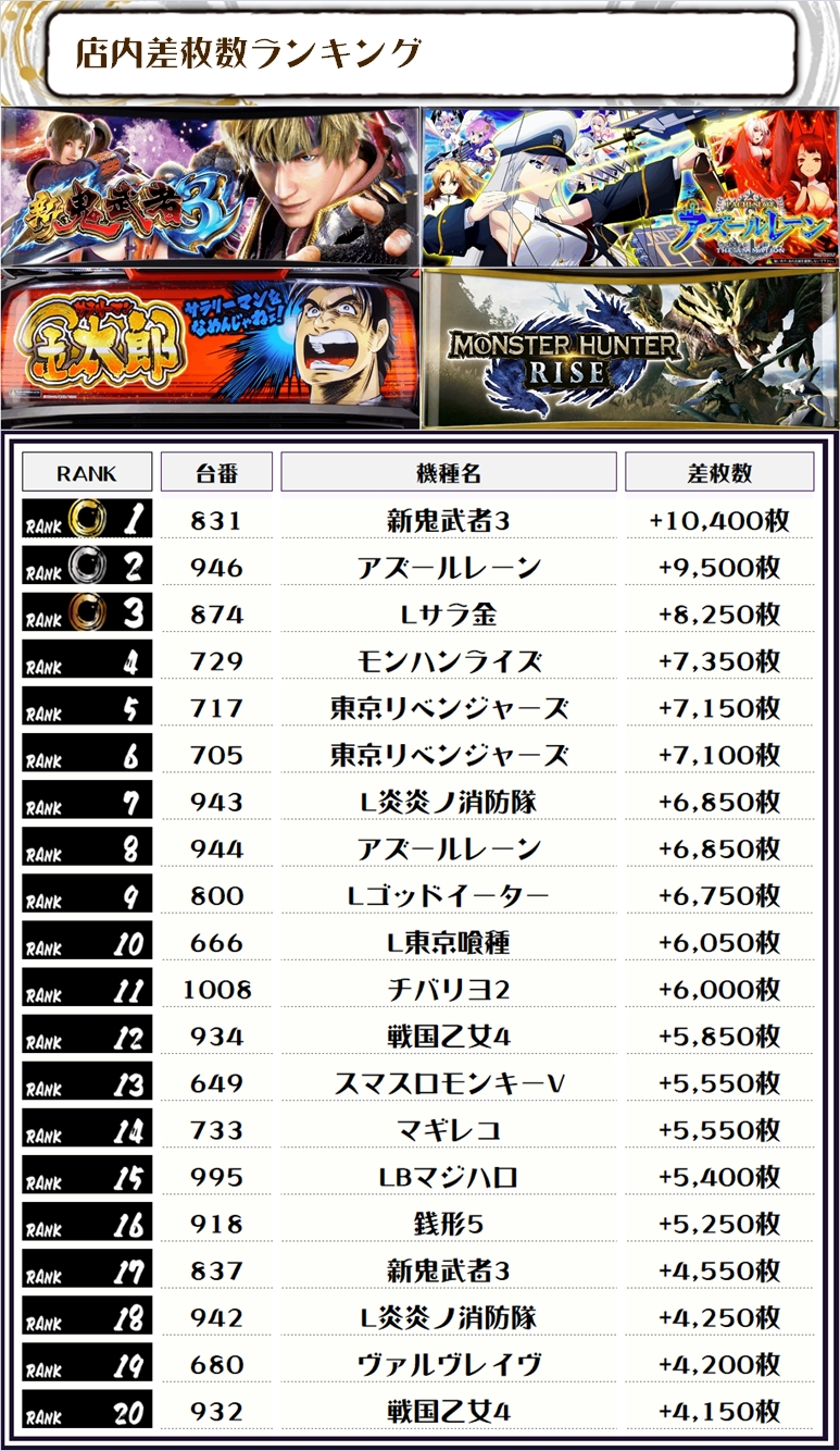 2位には【アズールレーン・946番台】の+9,500枚、そして3位には【Lサラ金・874番台】の+8,250枚がランクインっ🏆🏆🏆🏆