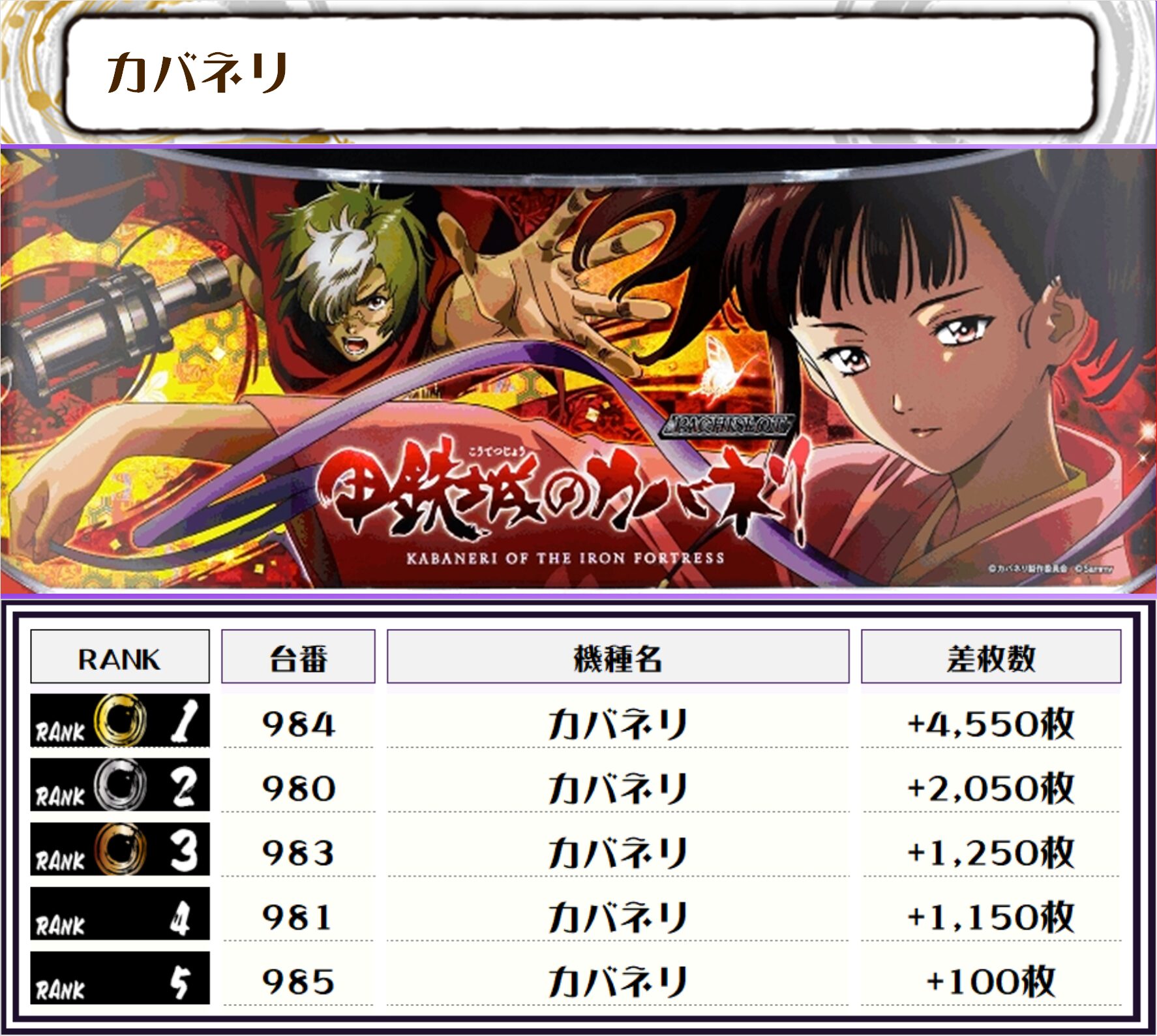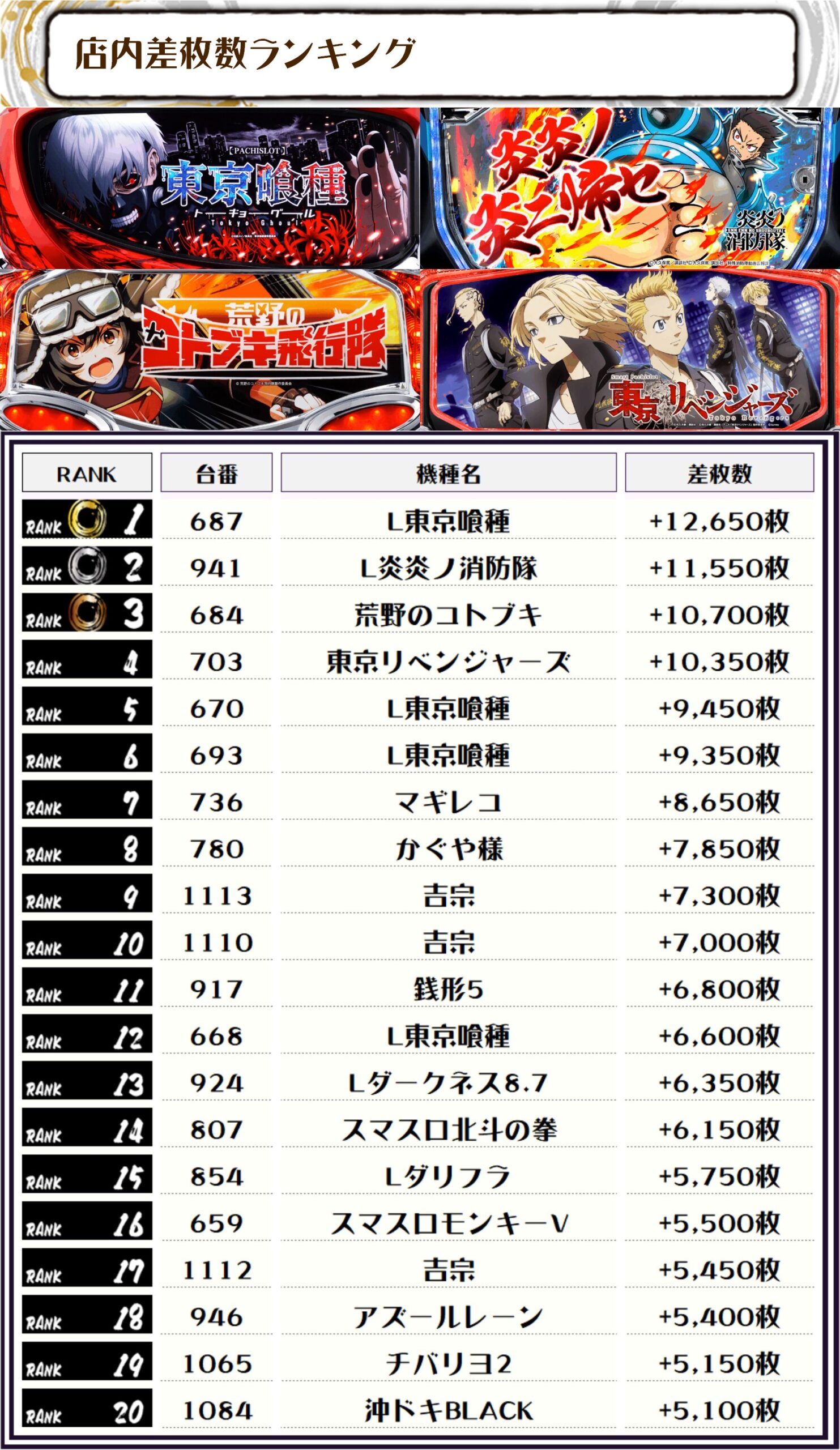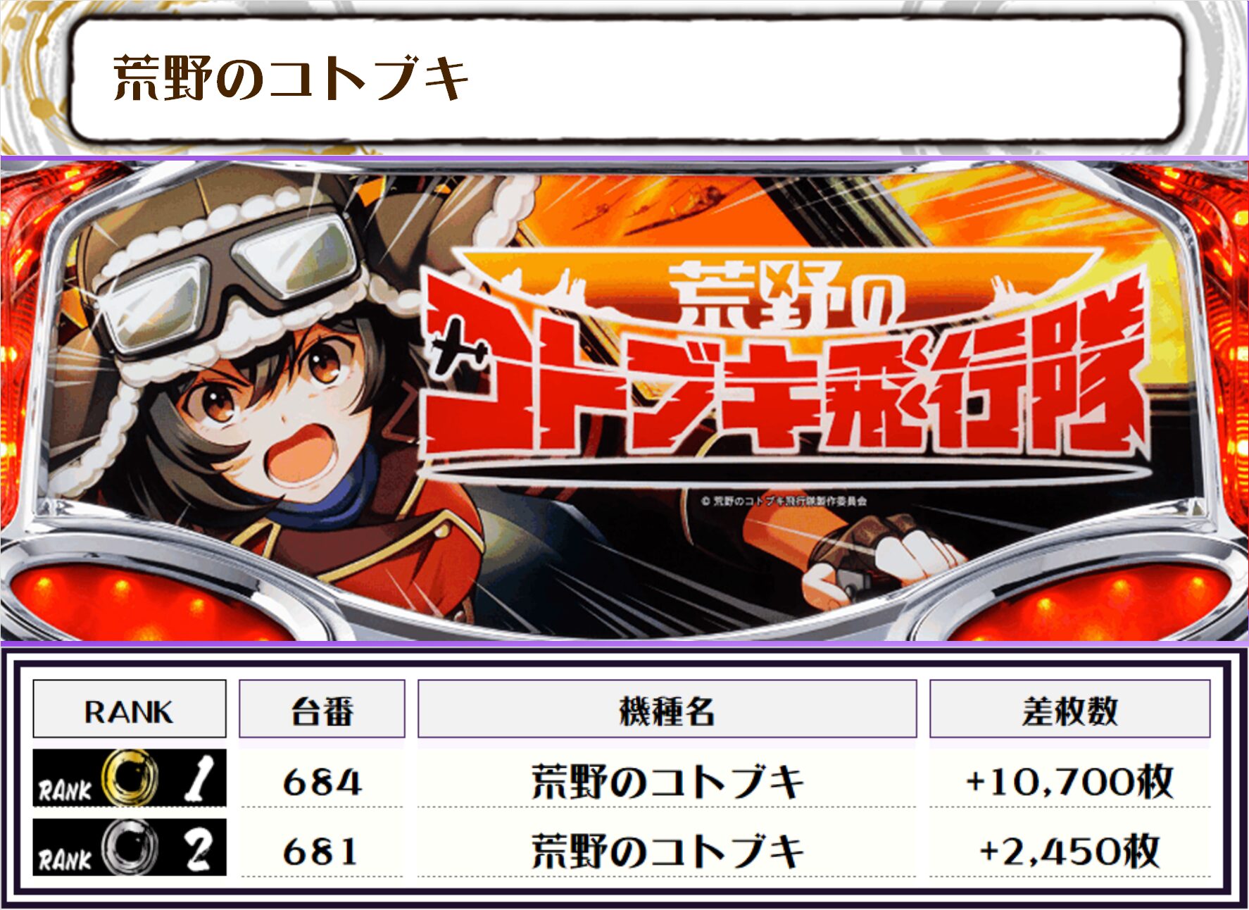 2位には【L炎炎ノ消防隊・941番台】の+11,550枚、そして3位には【荒野のコトブキ・684番台】の+10,700枚がランクインっ🏆🏆🏆🏆