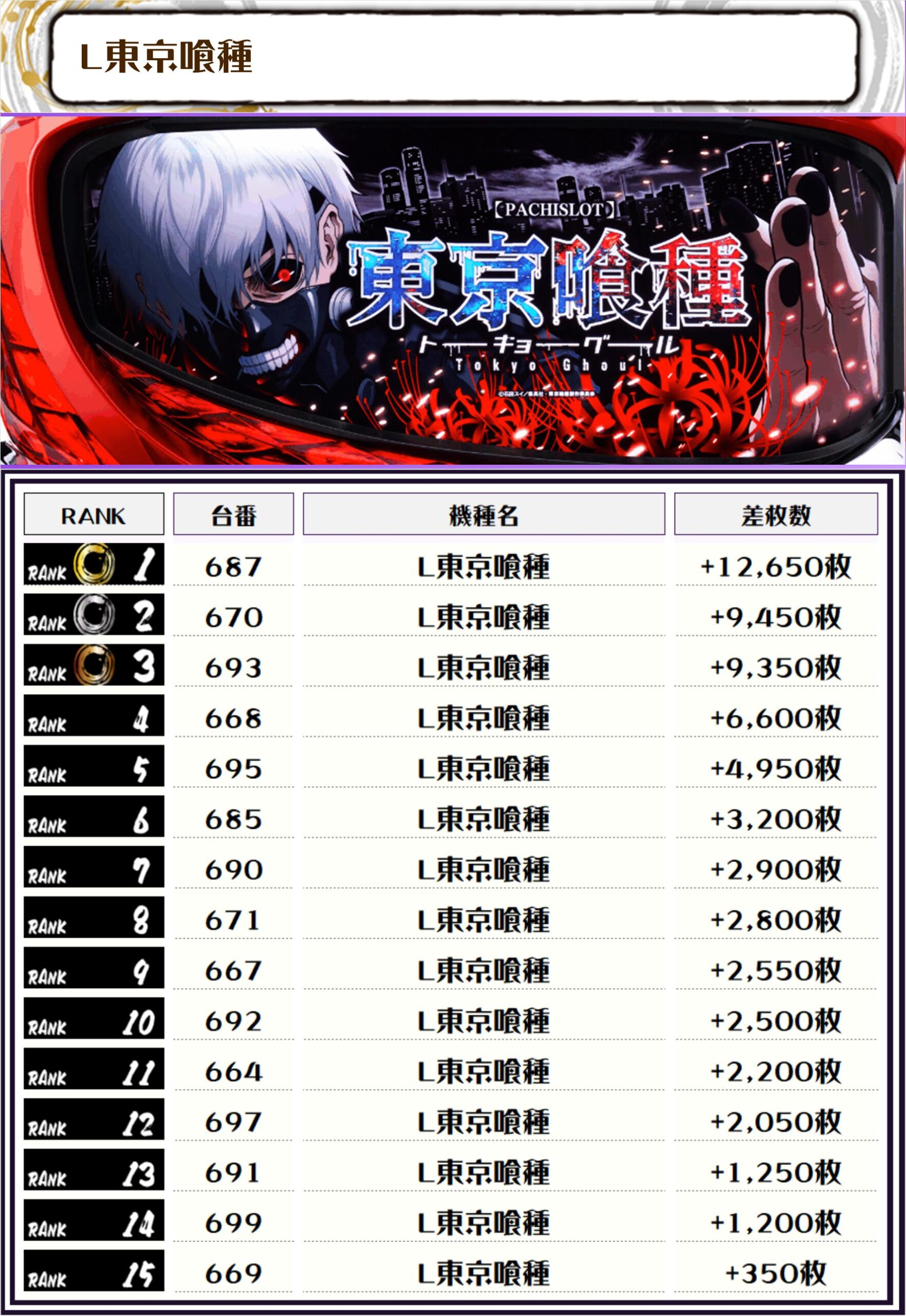 この日、全体の差枚トップに輝いたのは【L東京喰種・687番台】で+12,650枚‼️