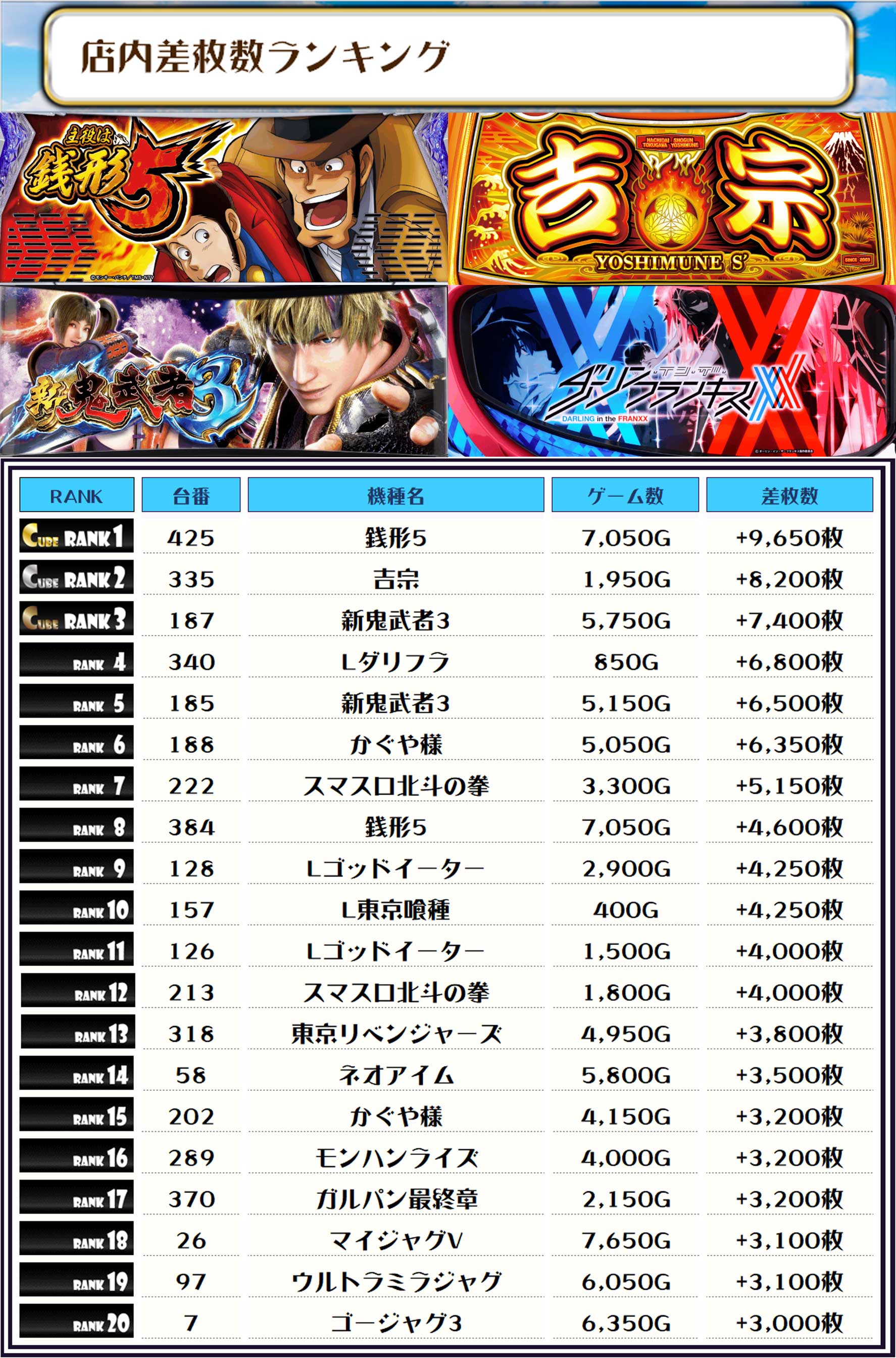 この日の店内全体差枚数ランキングはこちらでやんす‼️