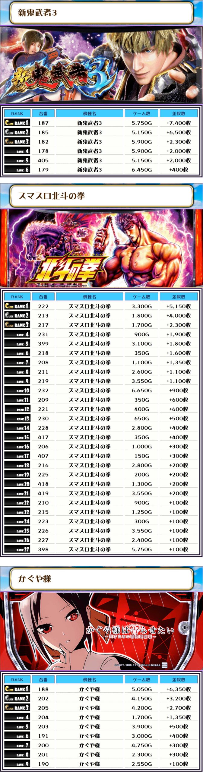 2位には【吉宗・335番台】の+8,200枚、そして3位には【新鬼武者3・187番台】の+7,400枚がランクインですっ🏆