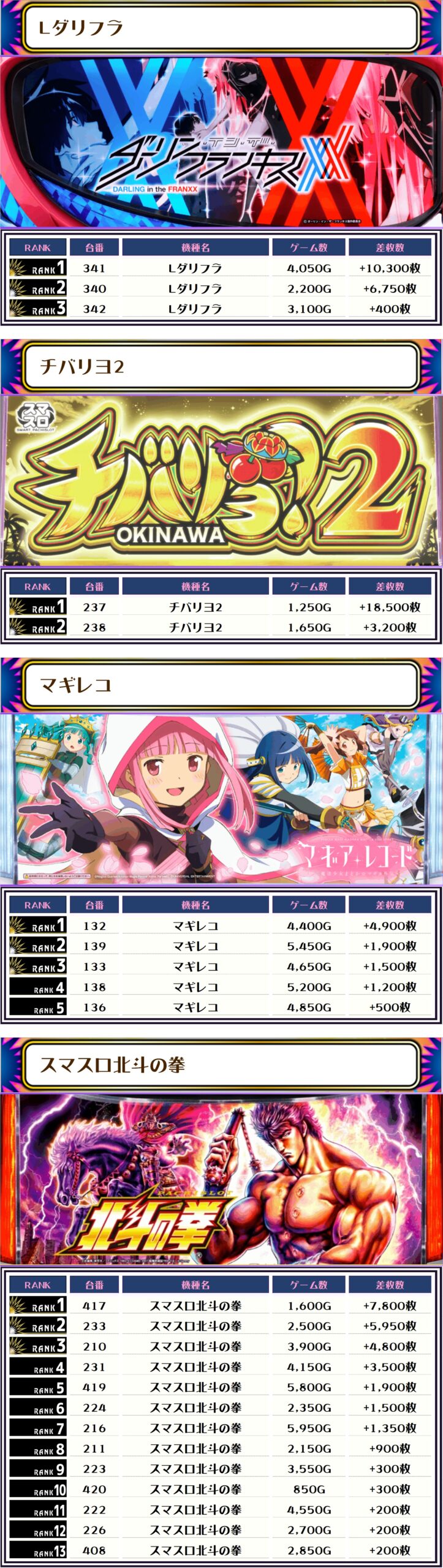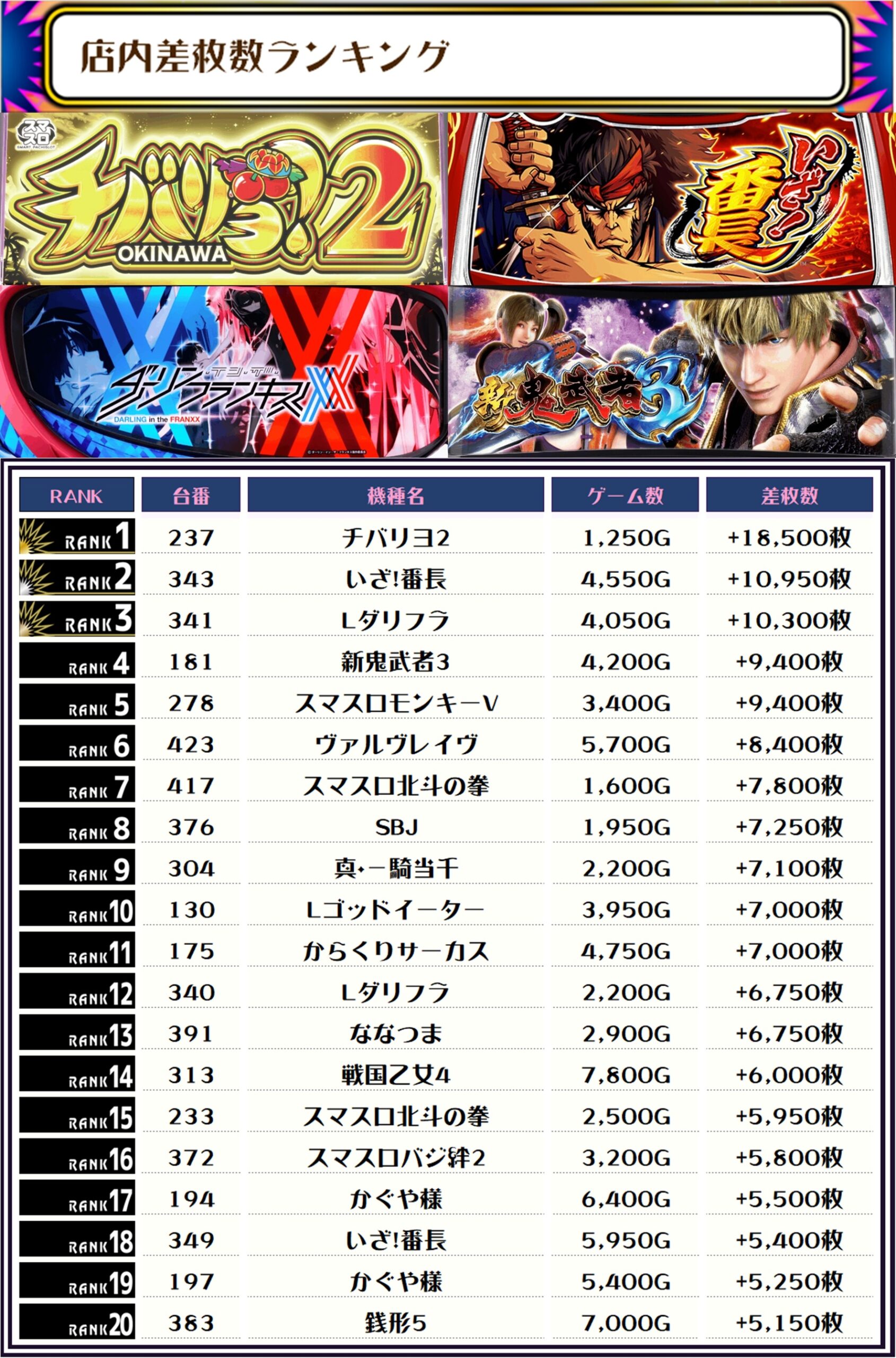2位には【いざ!番長・343番台】の+10,950枚、そして3位には【Lダリフラ・341番台】の+10,300枚がランクインですっ🏆