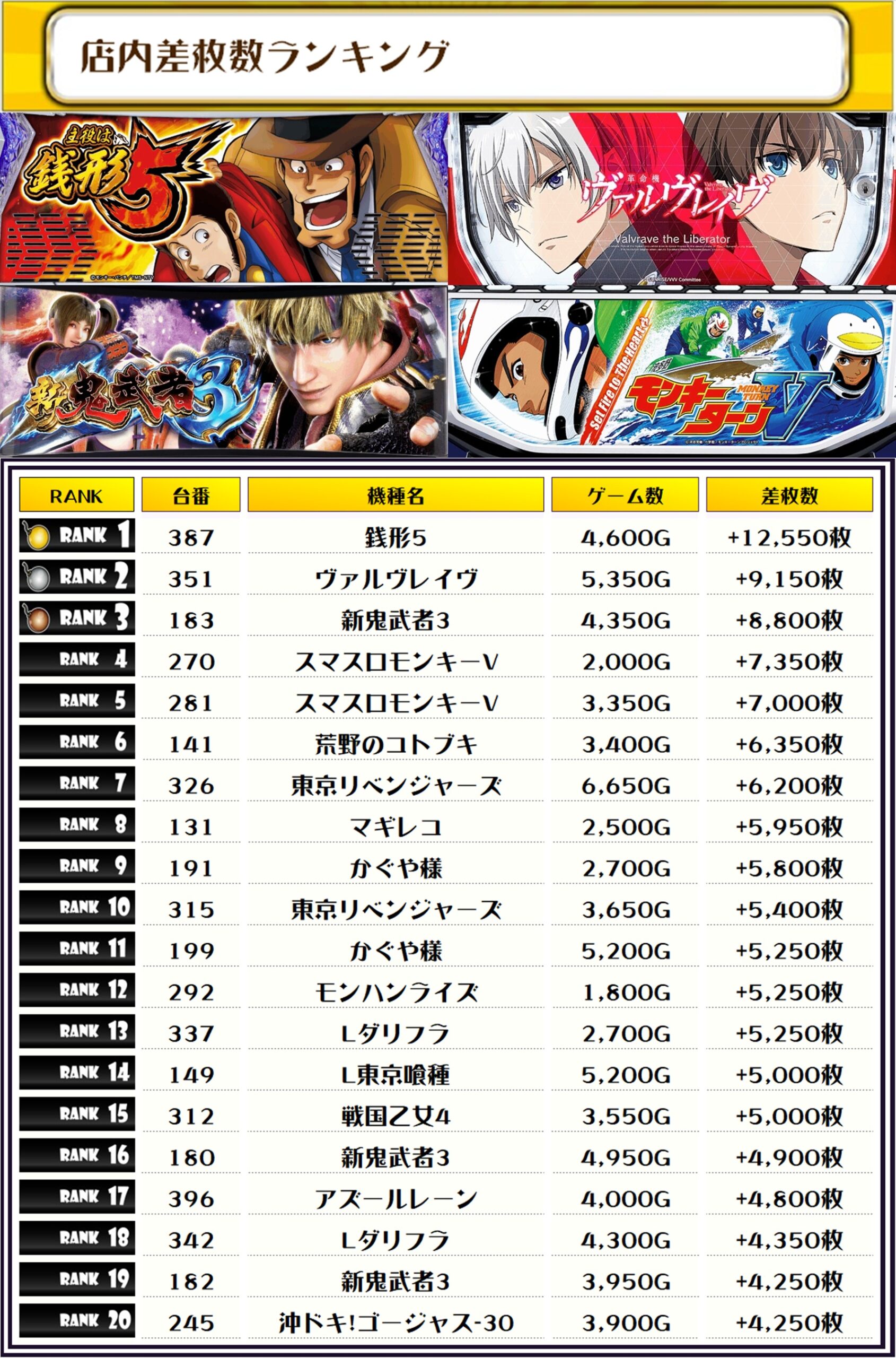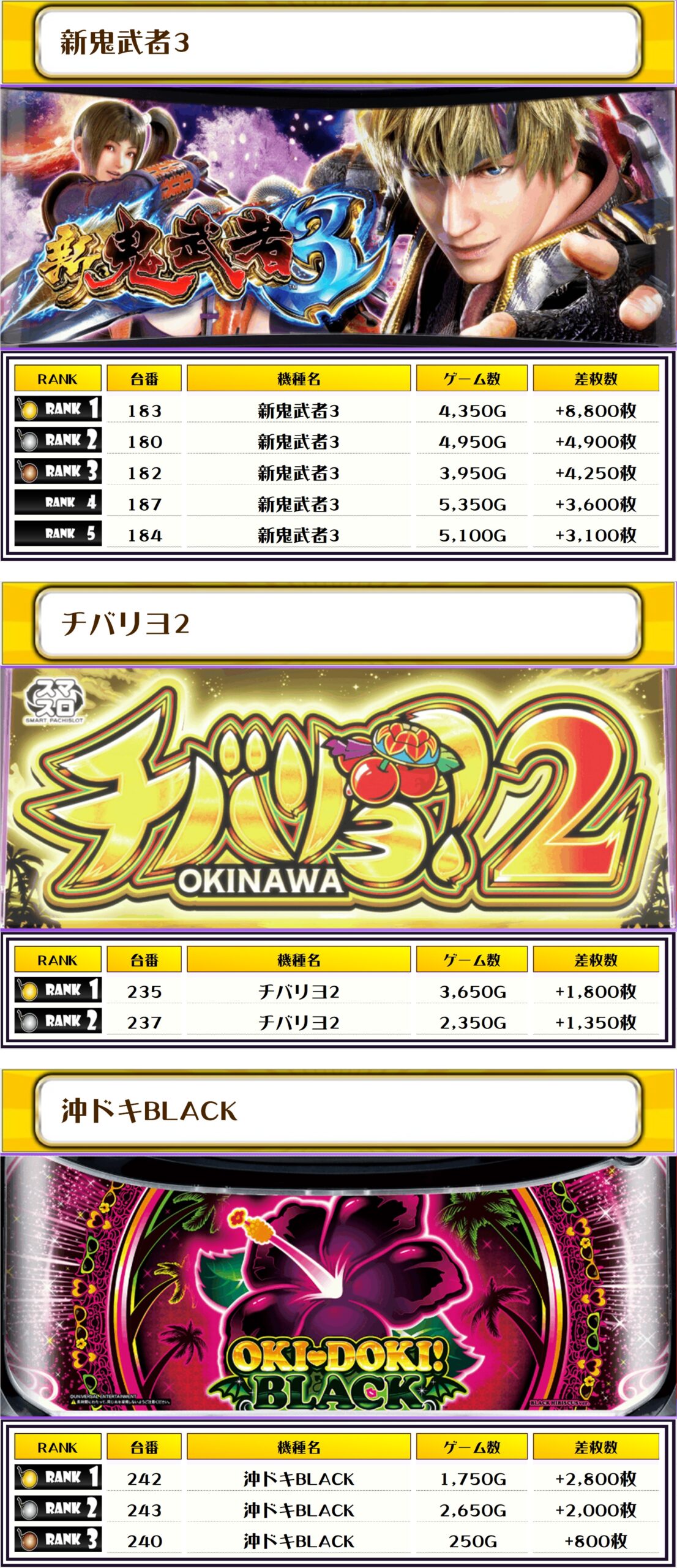 2位には【ヴァルヴレイヴ・351番台】の+9,150枚、そして3位には【新鬼武者3・183番台】の+8,800枚がランクインですっ🏆