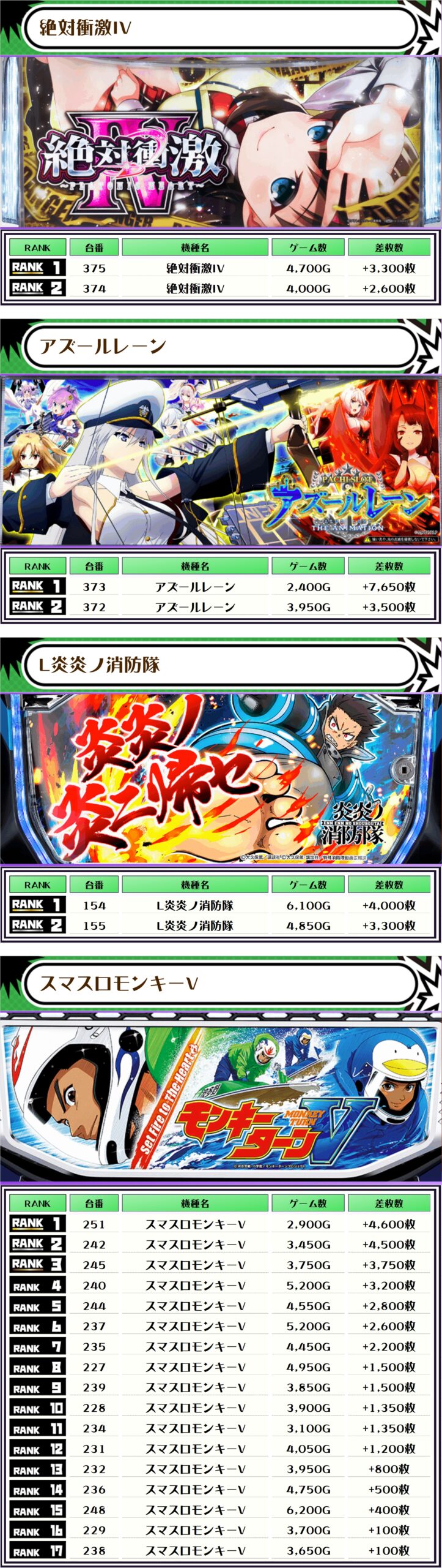 中でも絶対衝撃・アズールレーン・炎炎は満台だった時間が長かったようですよ~