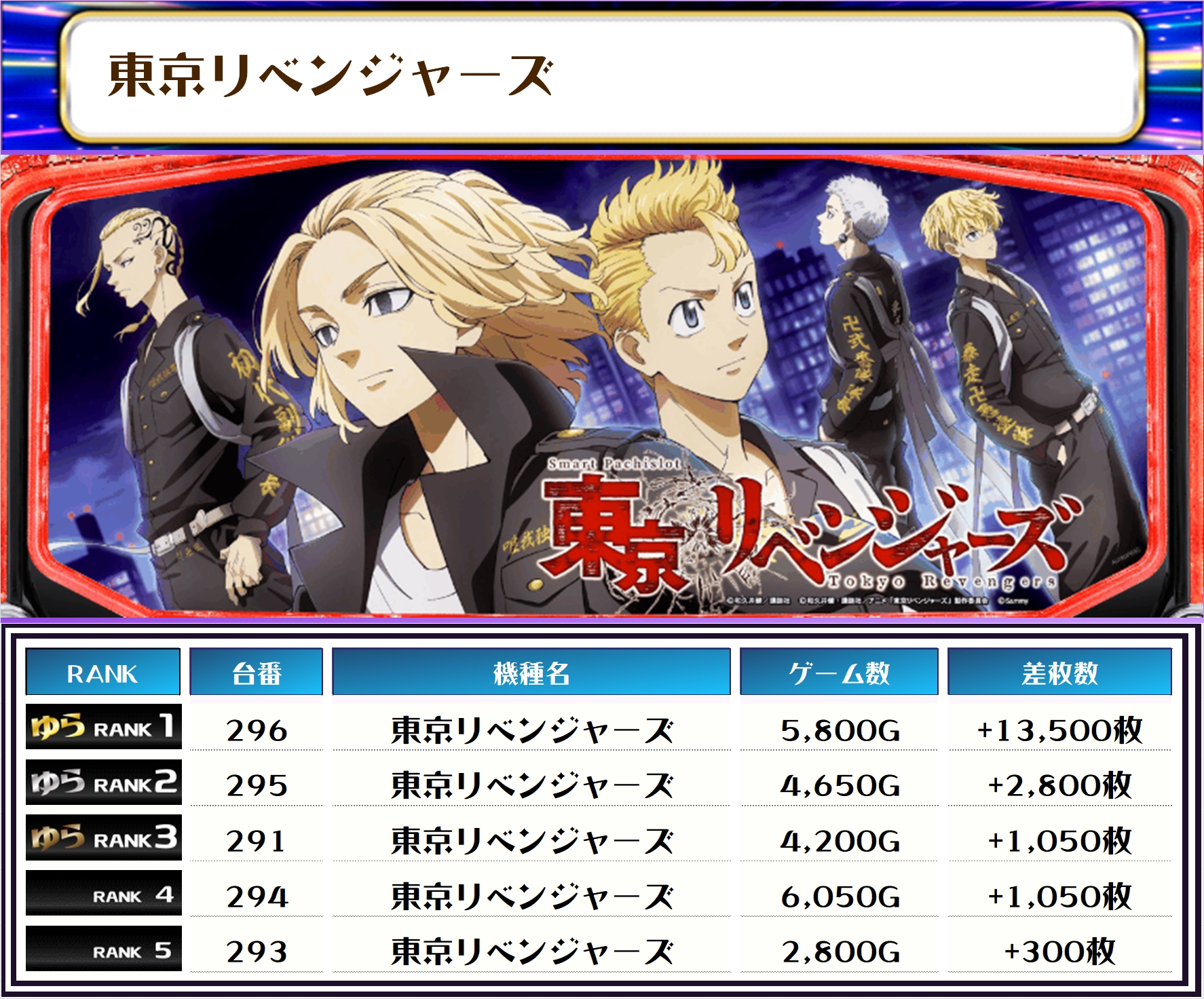 この日、全体の差枚トップに輝いたのは【東京リベンジャーズ・296番台】で+13,500枚❣️
