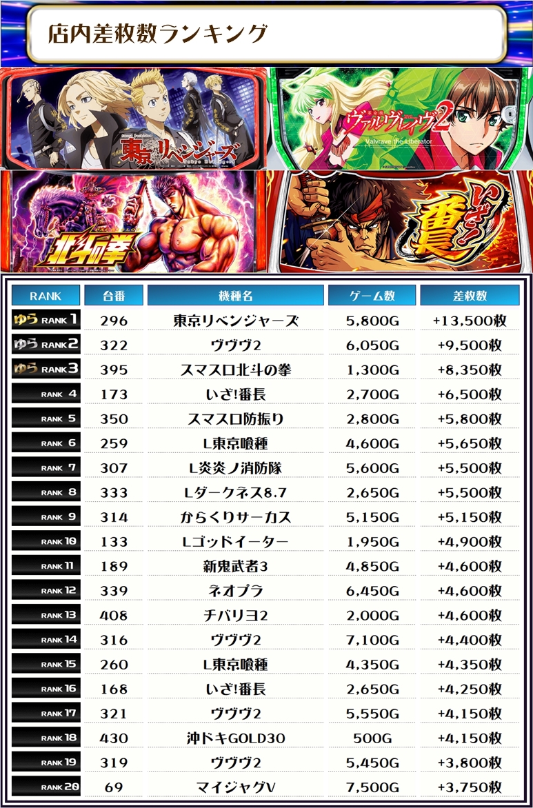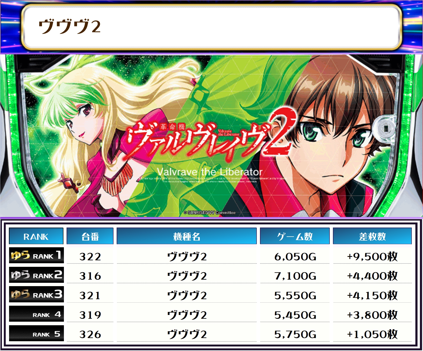 2位には【ヴヴヴ2・322番台】の+9,500枚、そして3位には【スマスロ北斗の拳・395番台】の+8,350枚がランクインですっ🏆