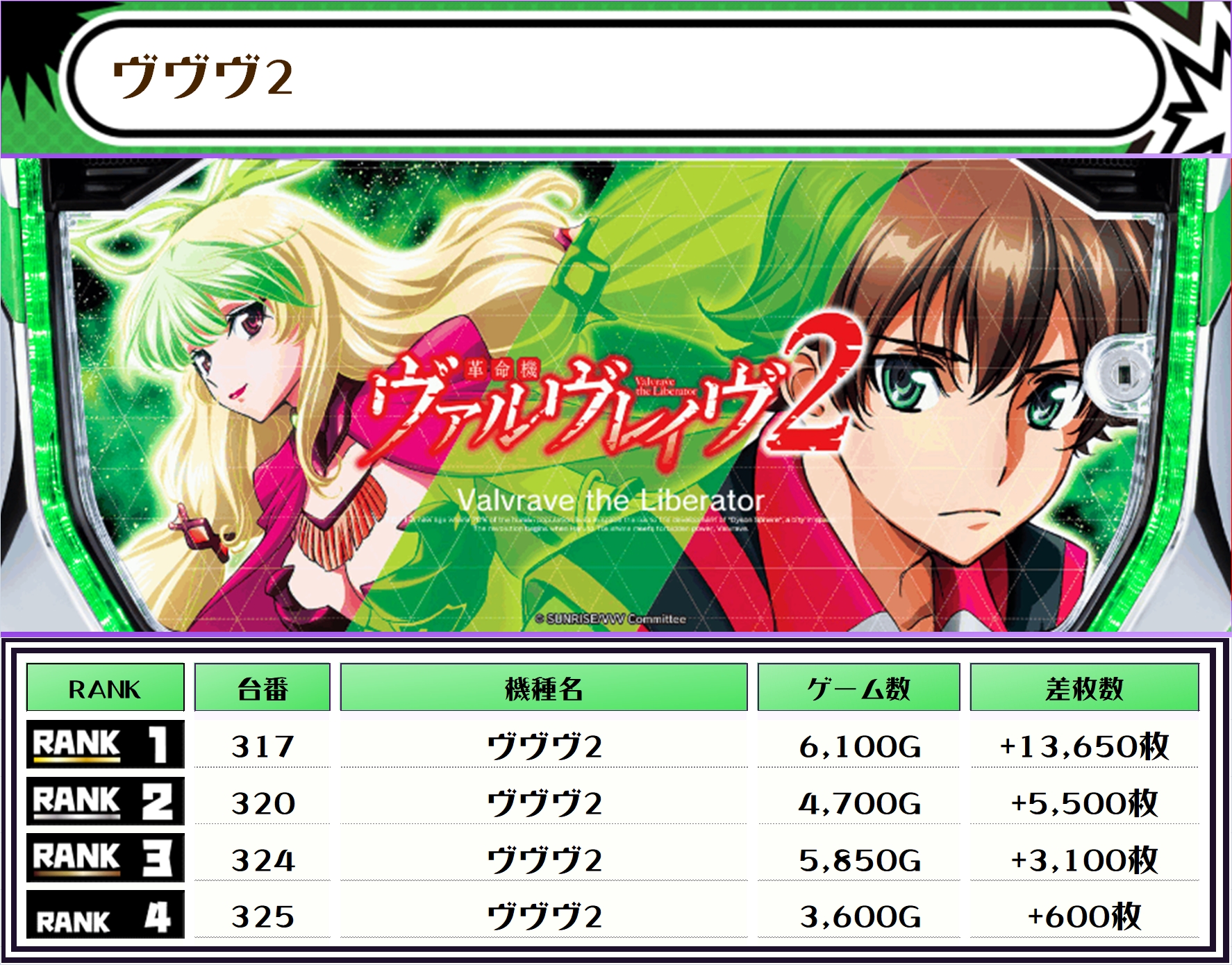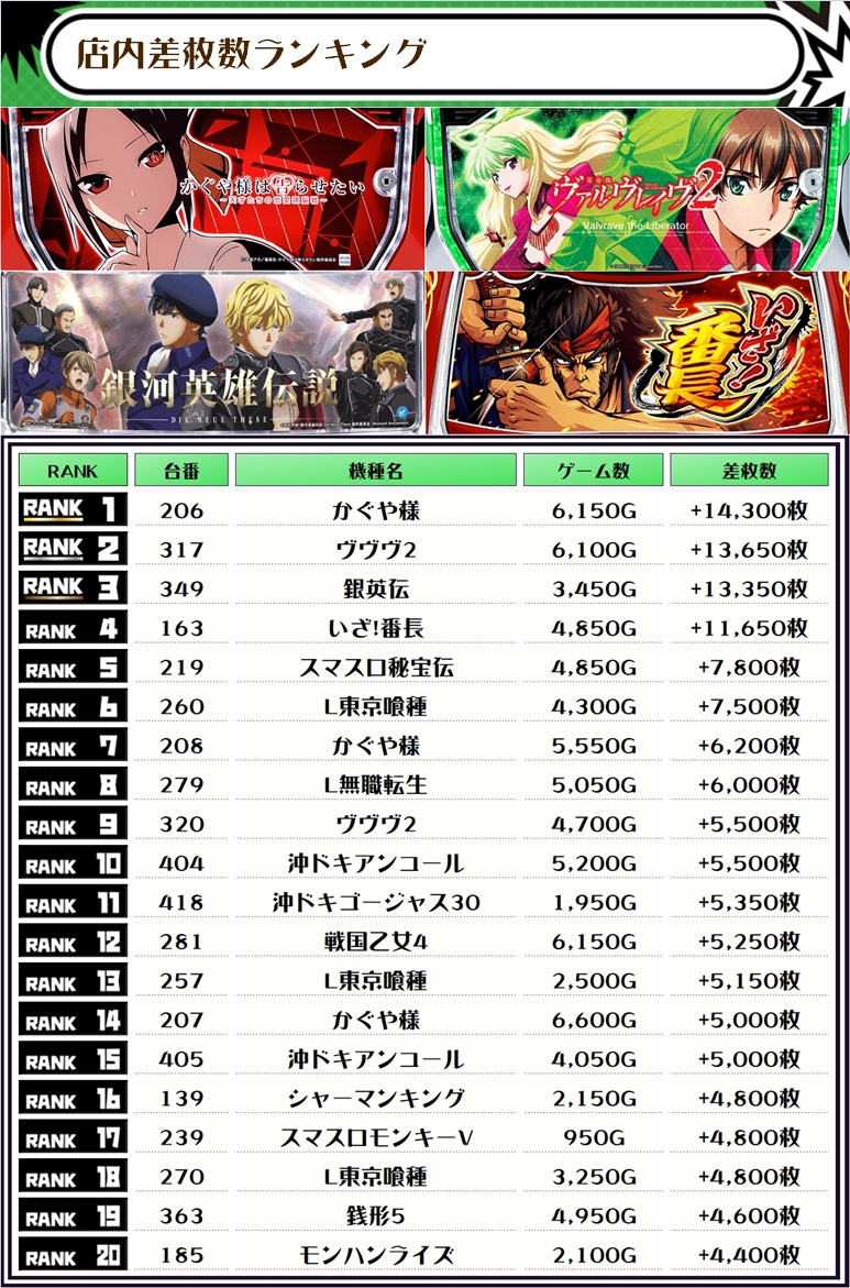 2位には【ヴヴヴ2・317番台】の+13,650枚、3位には【銀英伝・349番台】の+13,350枚がランクインですっ🏆