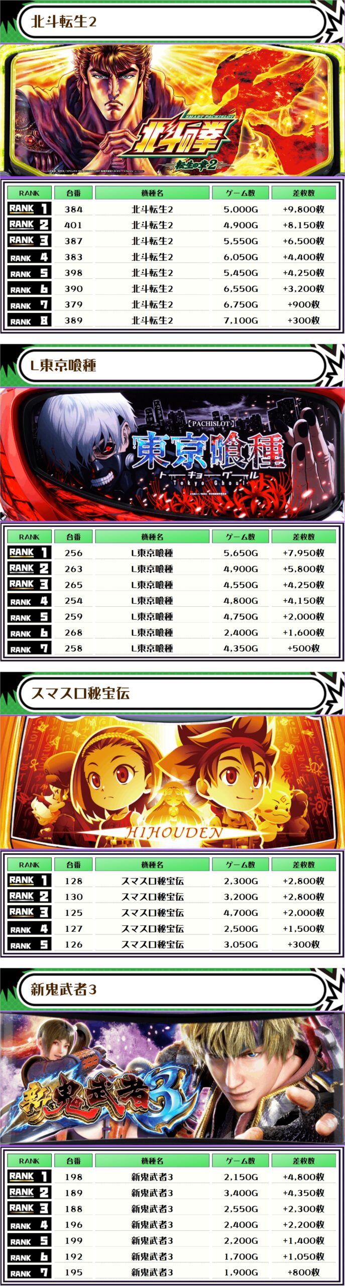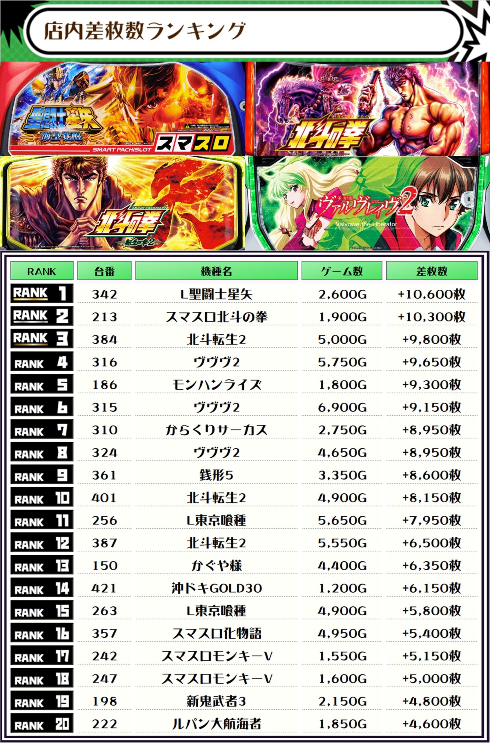 2位には【スマスロ北斗の拳・213番台】の+10,300枚、3位には【北斗転生2・384番台】の+9,800枚がランクインですっ🏆