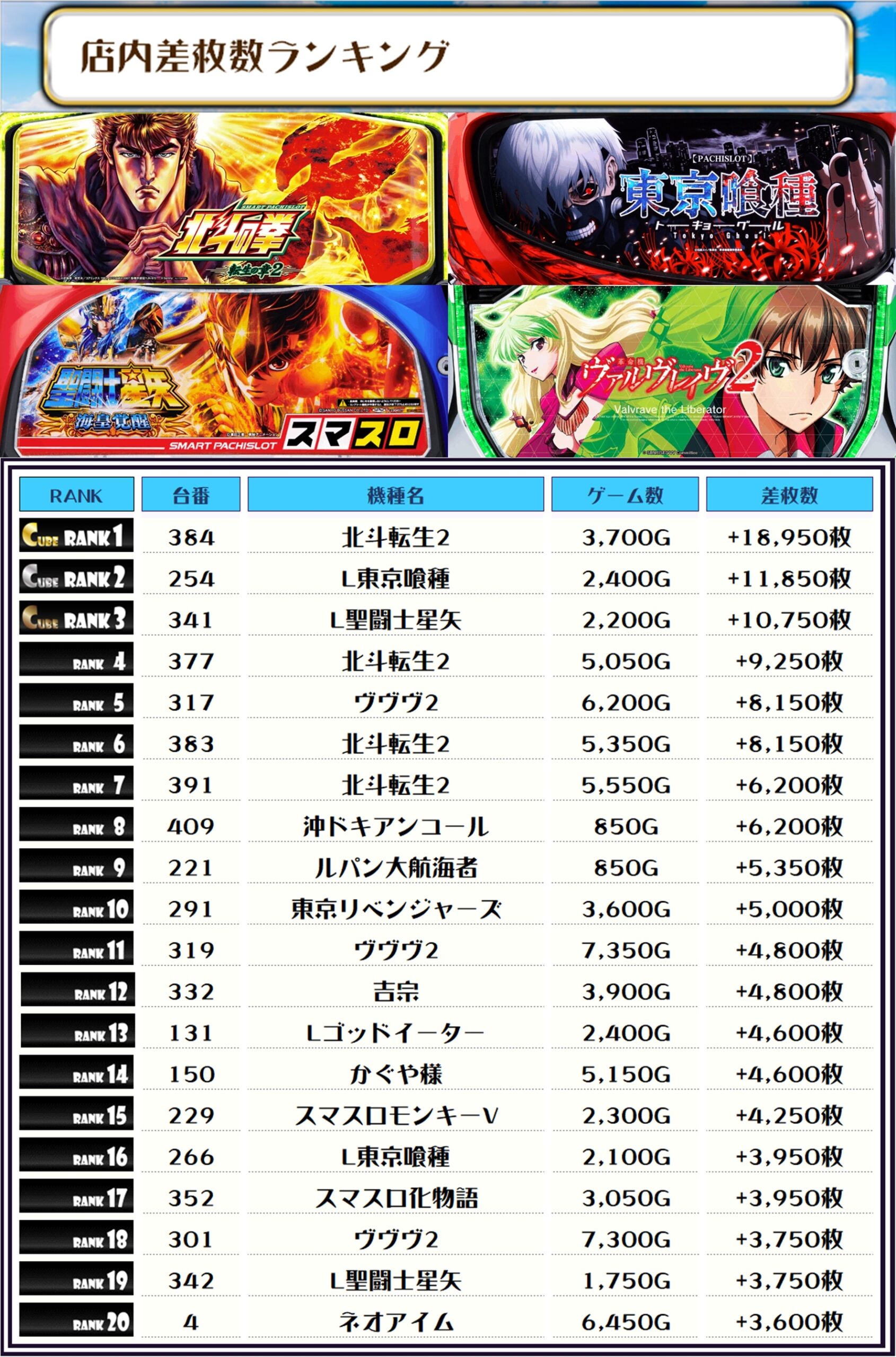 2位には【L東京喰種・254番台】の+11,850枚、そして3位には【L聖闘士星矢・341番台】の+10,750枚がランクインですっ🏆