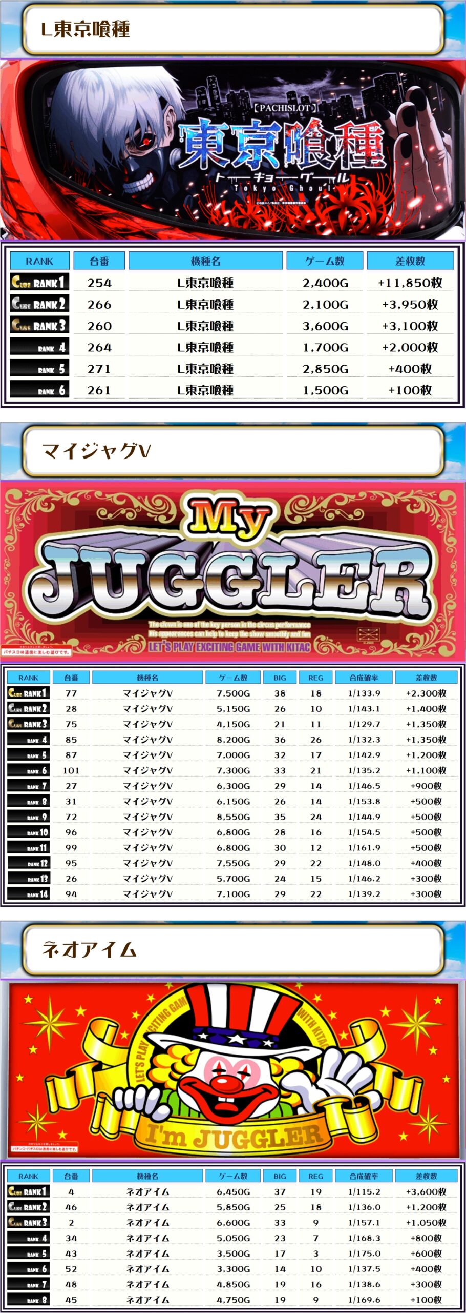特にマイジャグV・ネオアイムは至る所に優秀台を見かけました💖