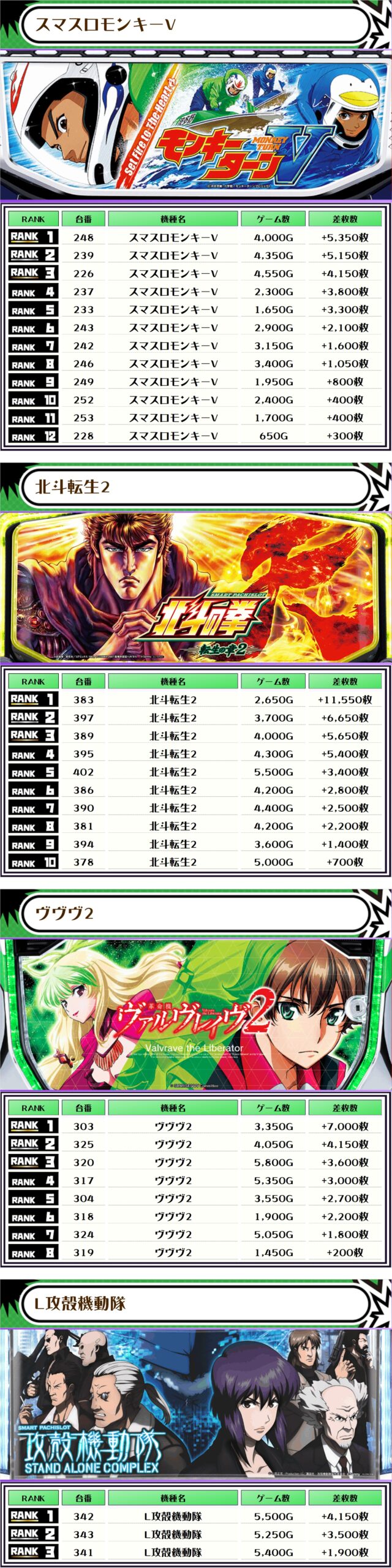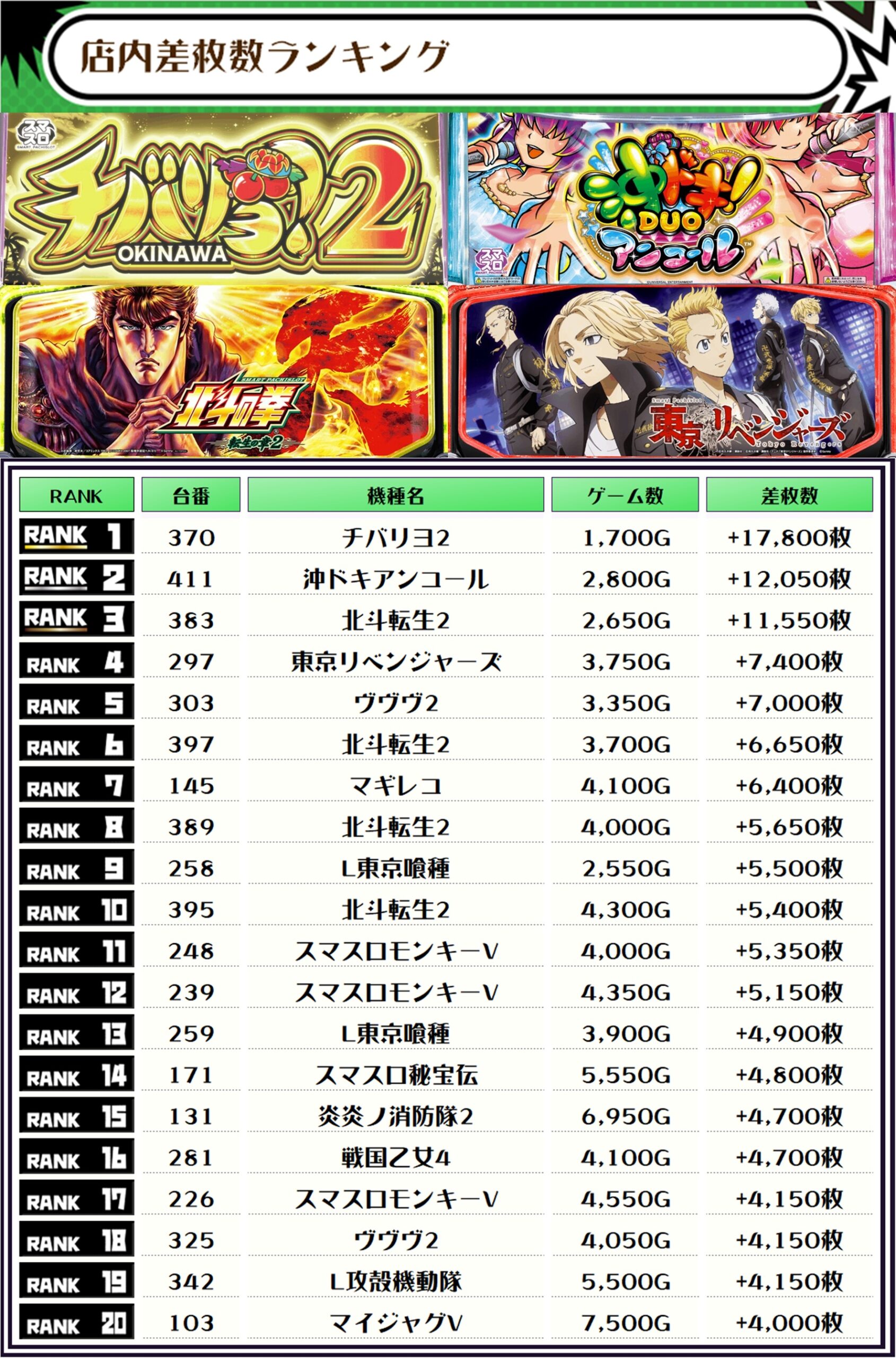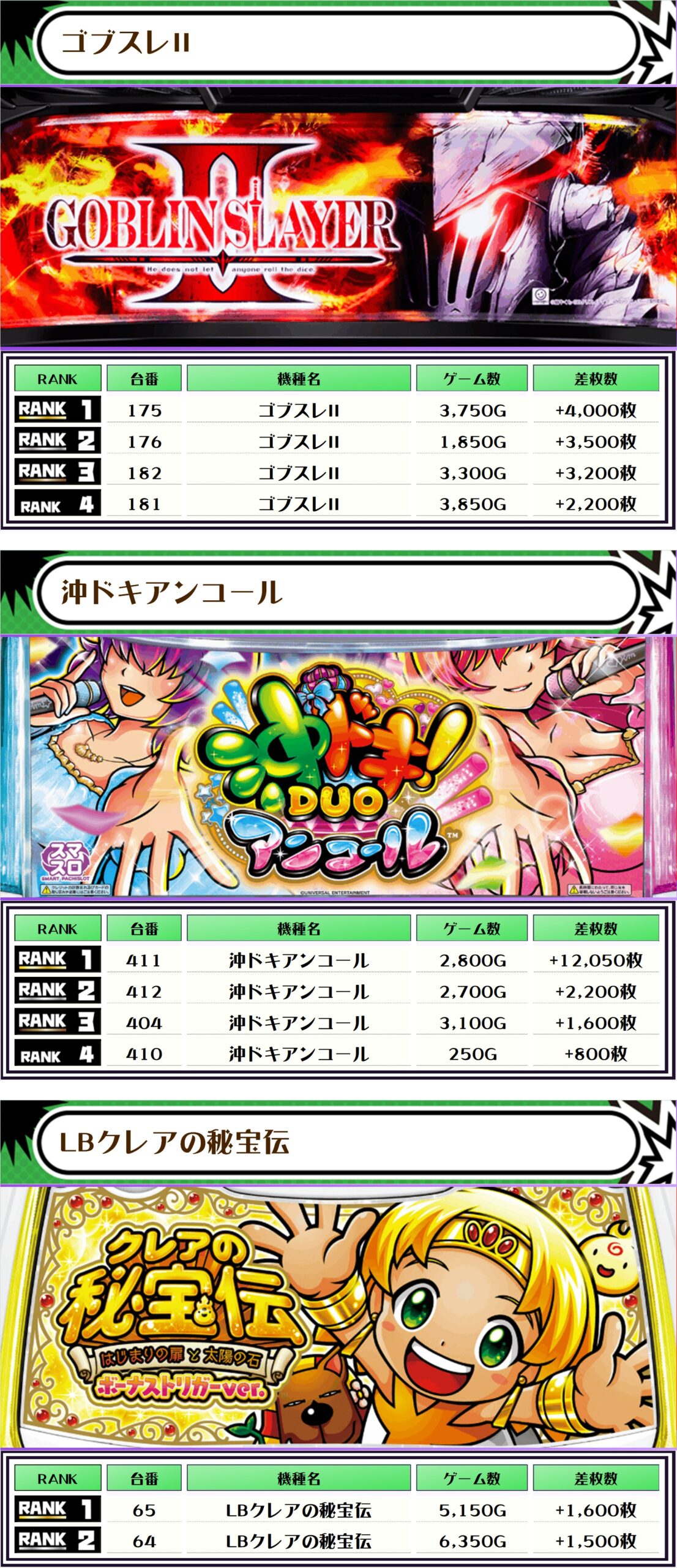 2位には【冲ドキアンコール・411番台】の+12,050枚、3位には【北斗転生2・383番台】の+11,550枚がランクインですっ🏆