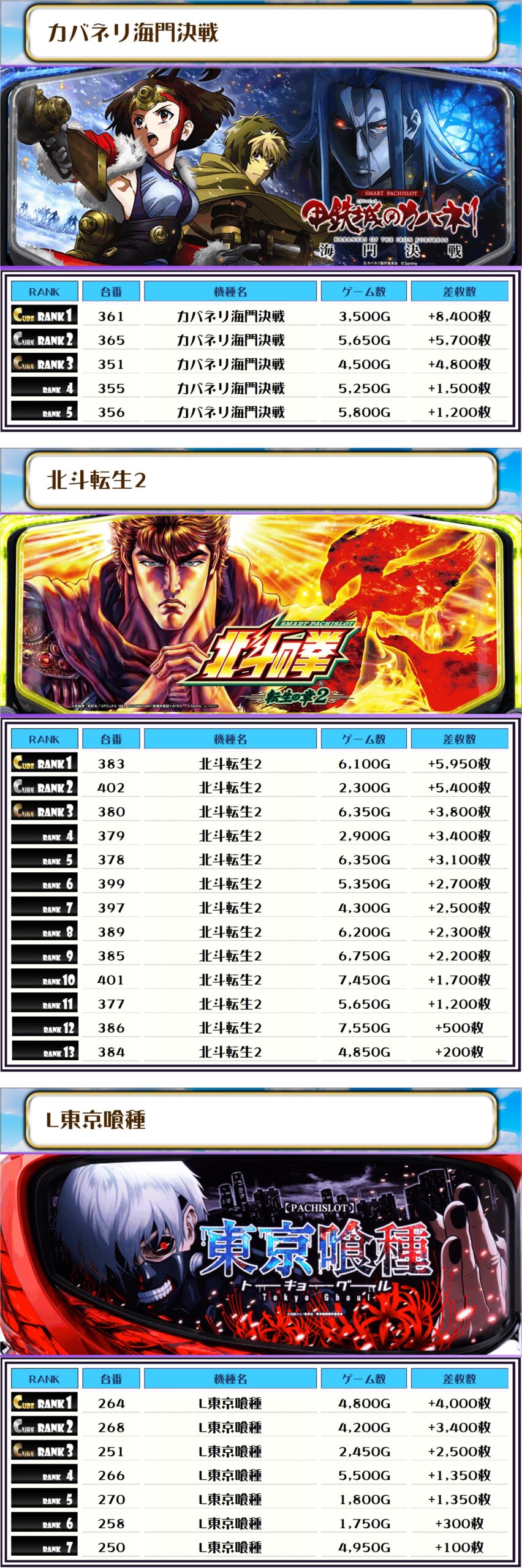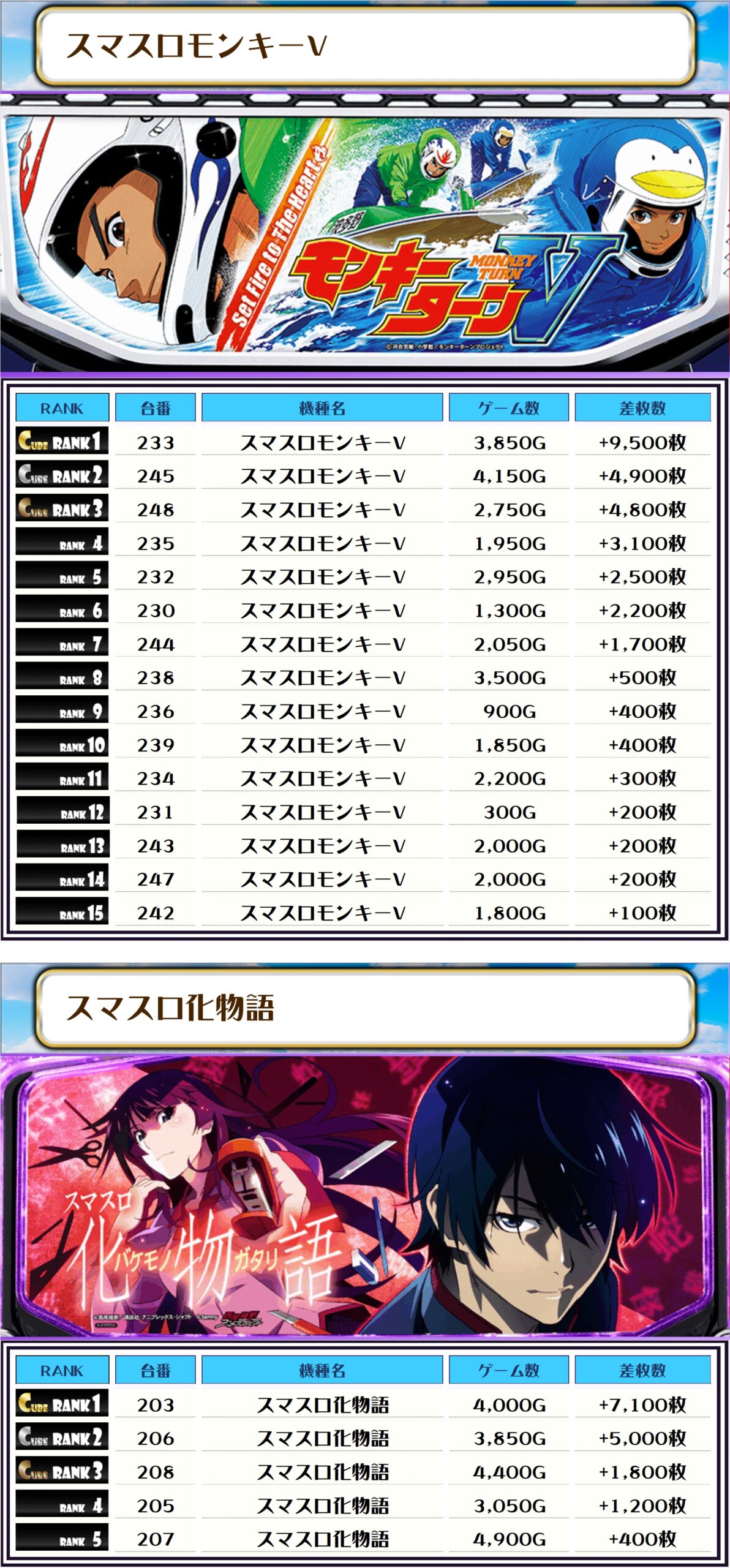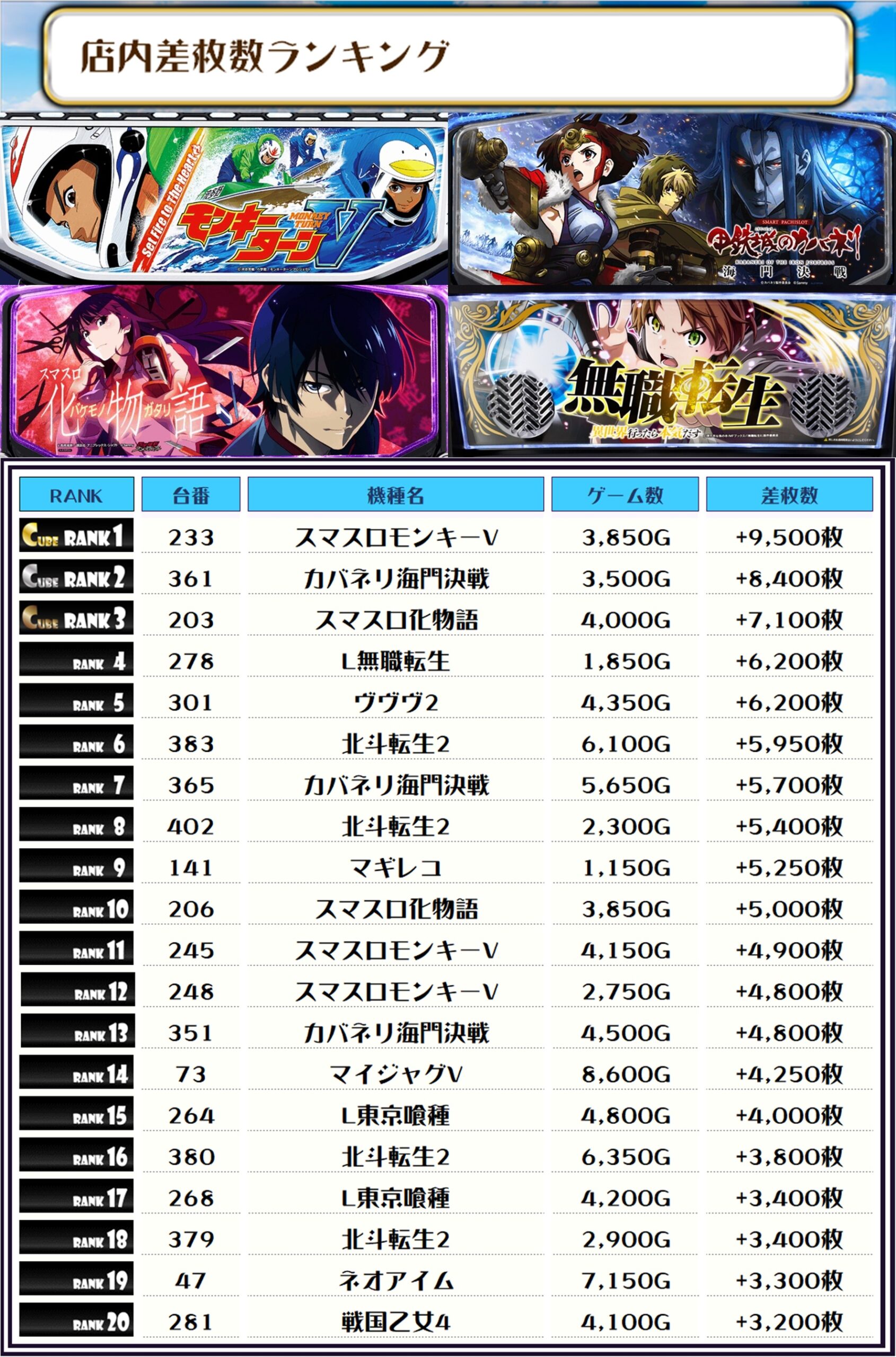 続く2位には【カバネリ海門決戦・361番台】の+8,400枚、そして3位には【スマスロ化物語・203番台】の+7,100枚がランクインですっ🏆