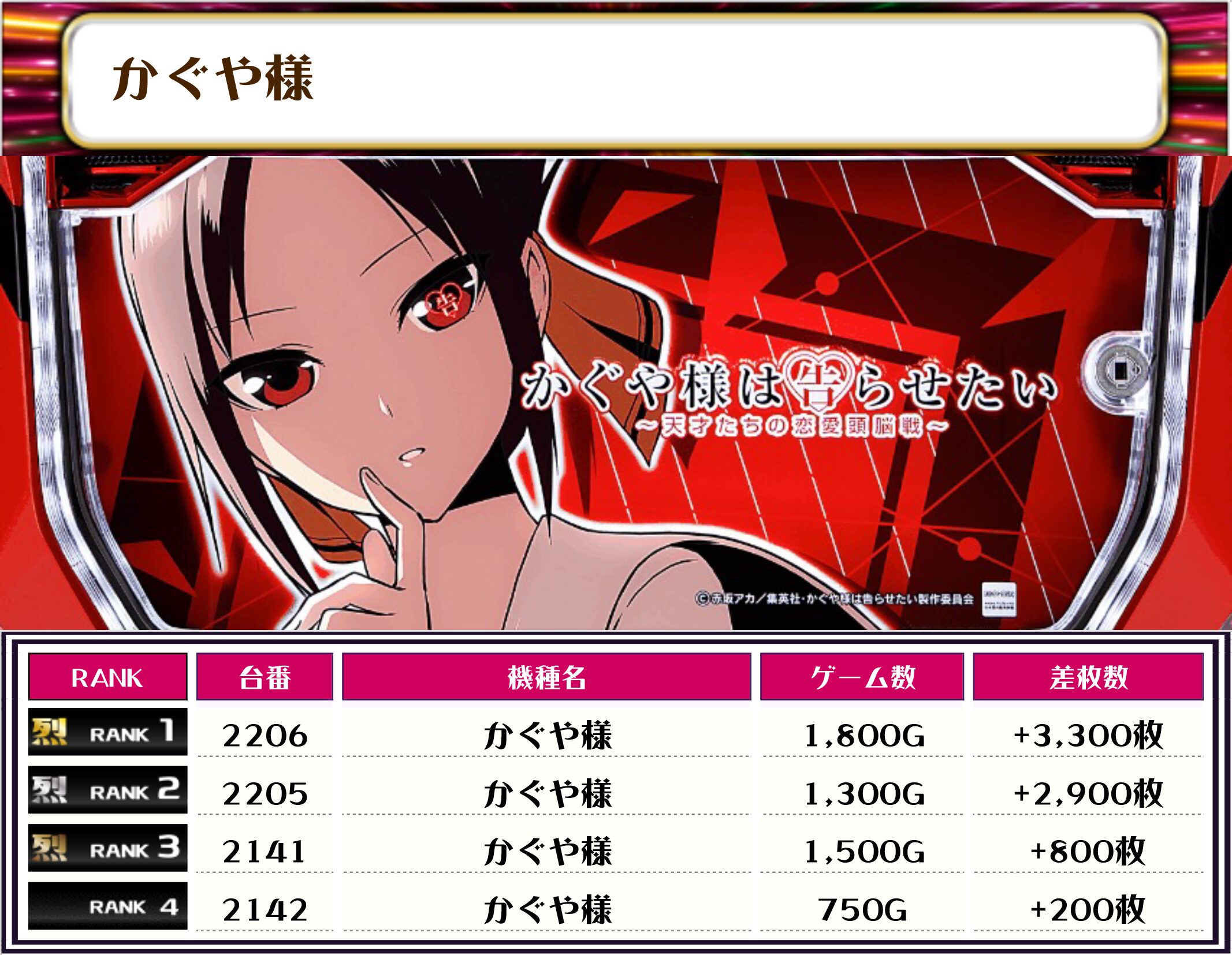 挙動が良さそうだったのはLダークネス8.7とかぐや様、戦国乙女4と女の子が活躍する台。この3機種に優秀台がたくさんあったように思えます❣️