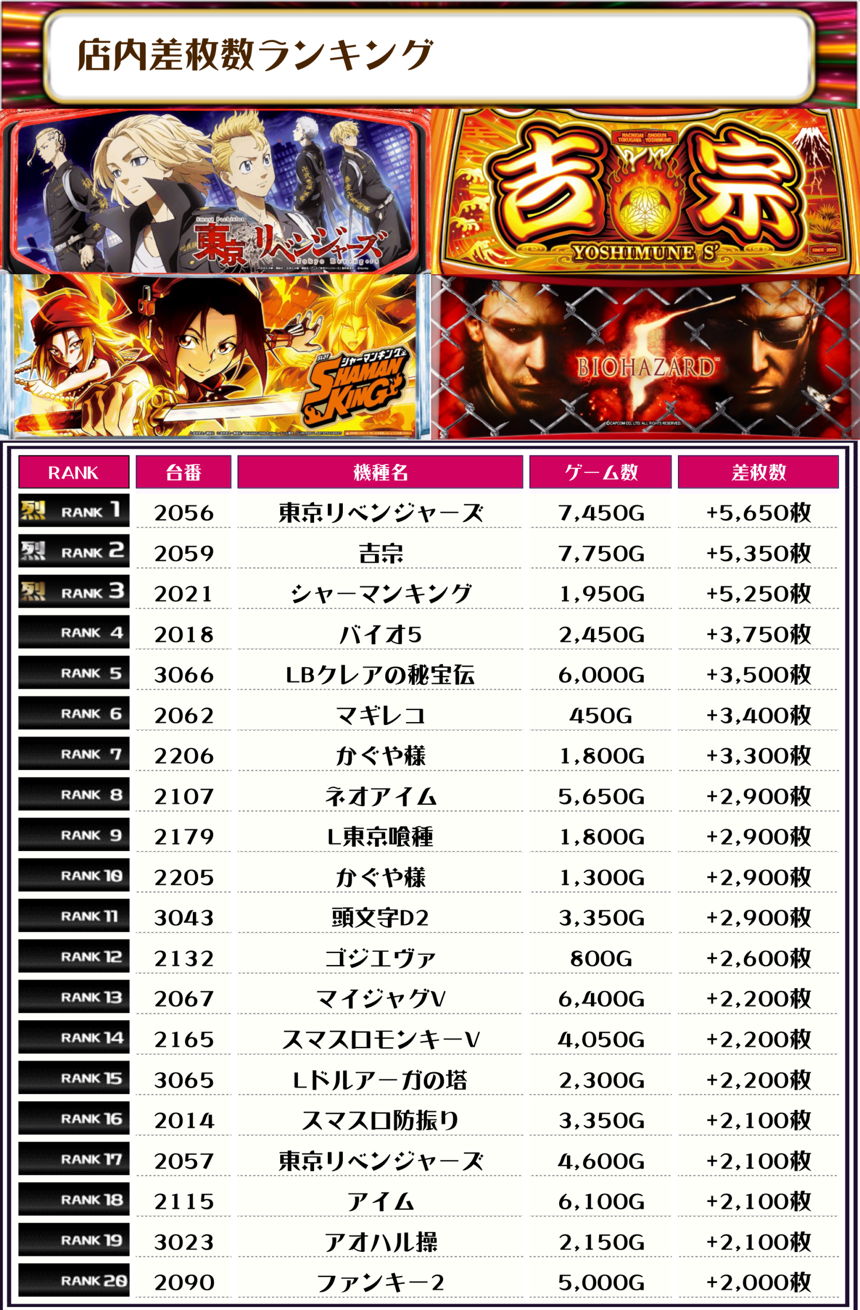 2位には【吉宗・2059番台】の+5,350枚、そして3位には【シャーマンキング・2021番台】の+5,250枚がランクインですっ🏆