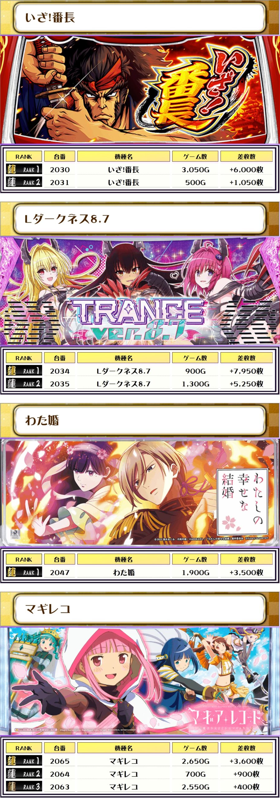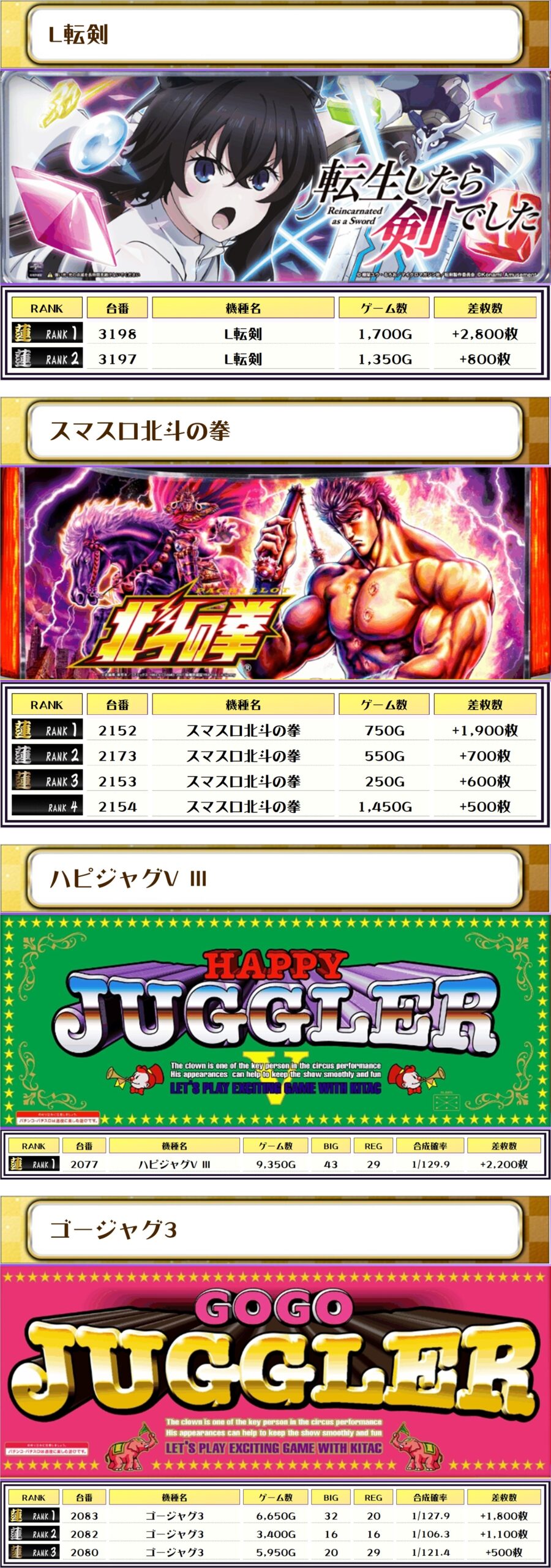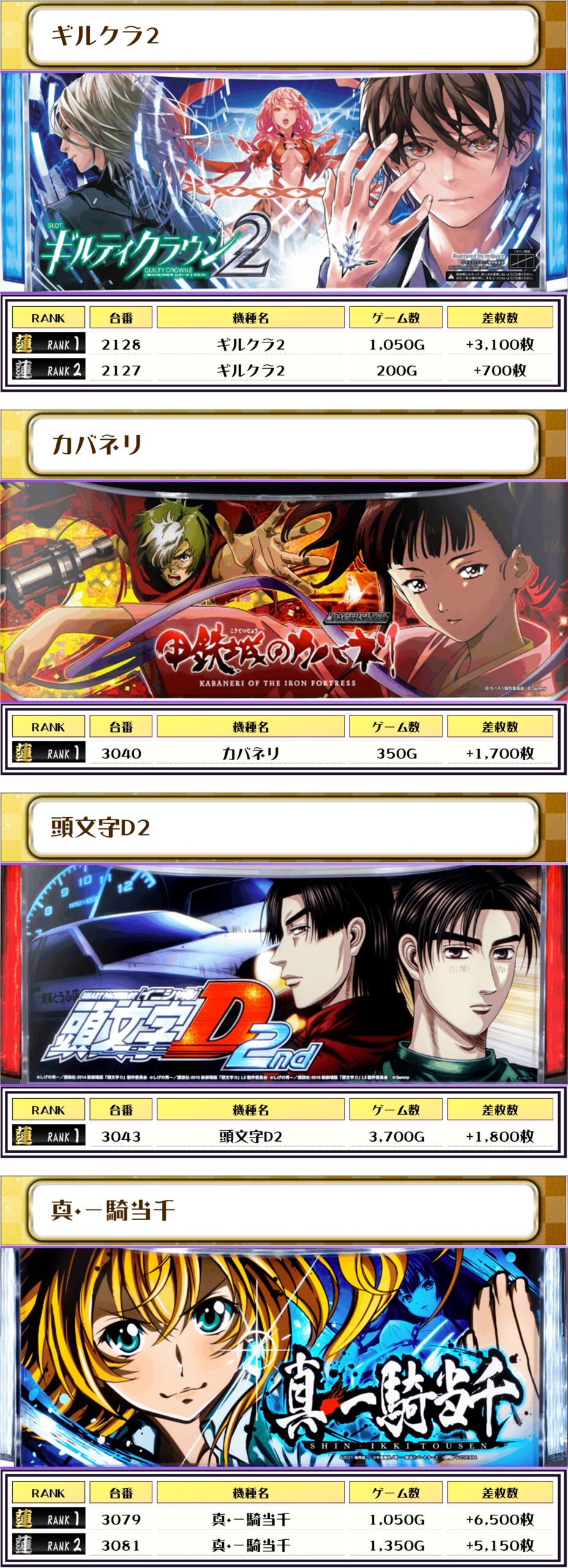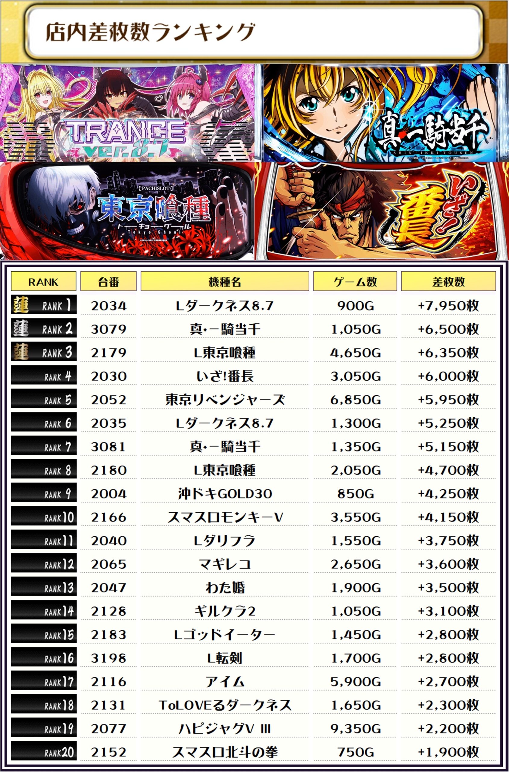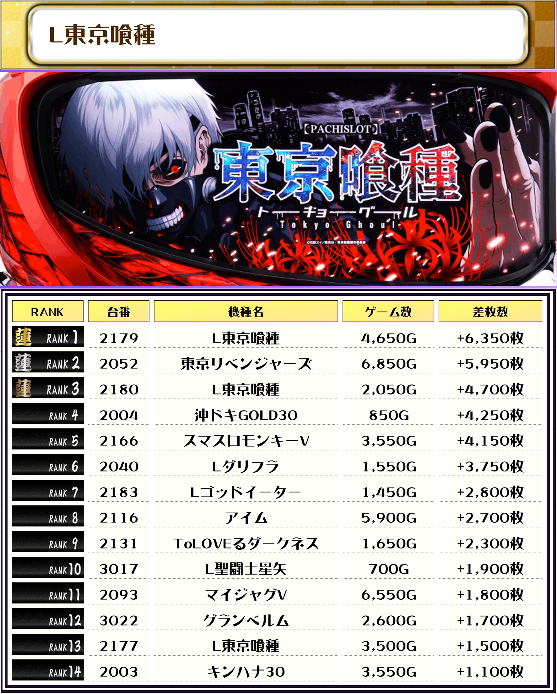 2位には【真・一騎当千・3079番台】の+6,500枚、3位には【L東京喰種・2179番台】の+6,350枚がランクインっ🏆🏆🏆🏆