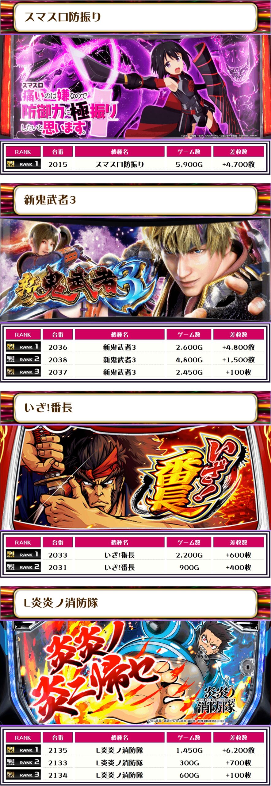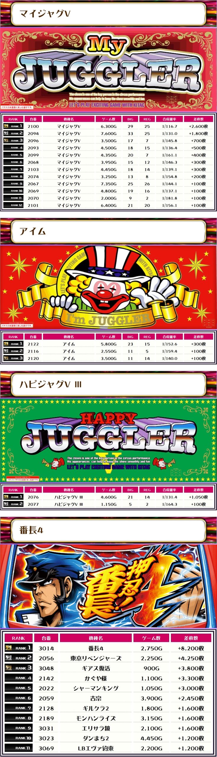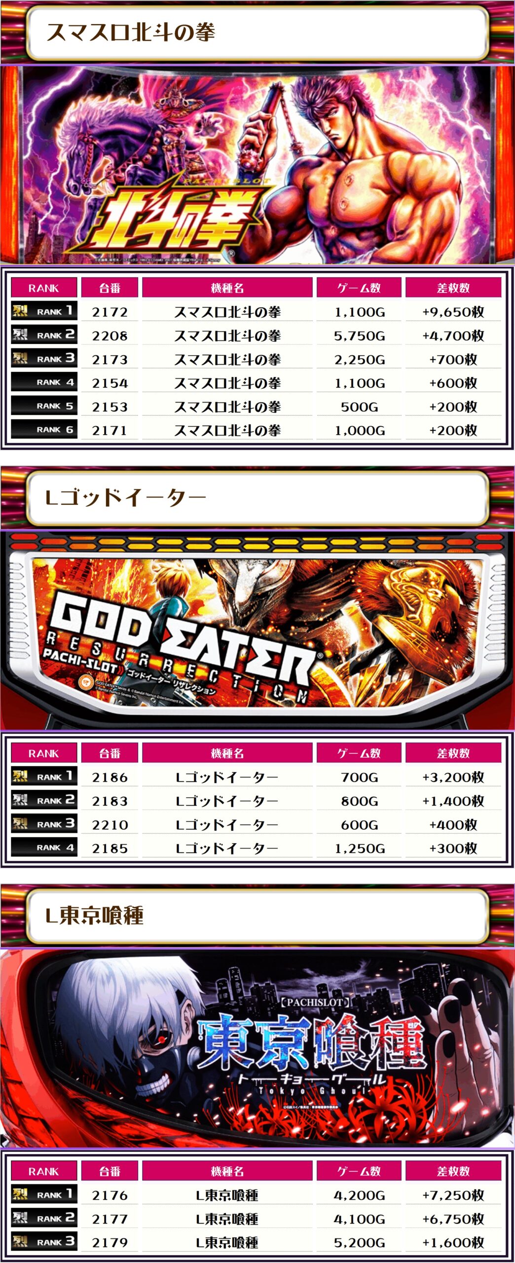 2位には【番長4・3014番台】の+8,200枚、そして3位には【L東京喰種・2176番台】の+7,250枚がランクインですっ🏆