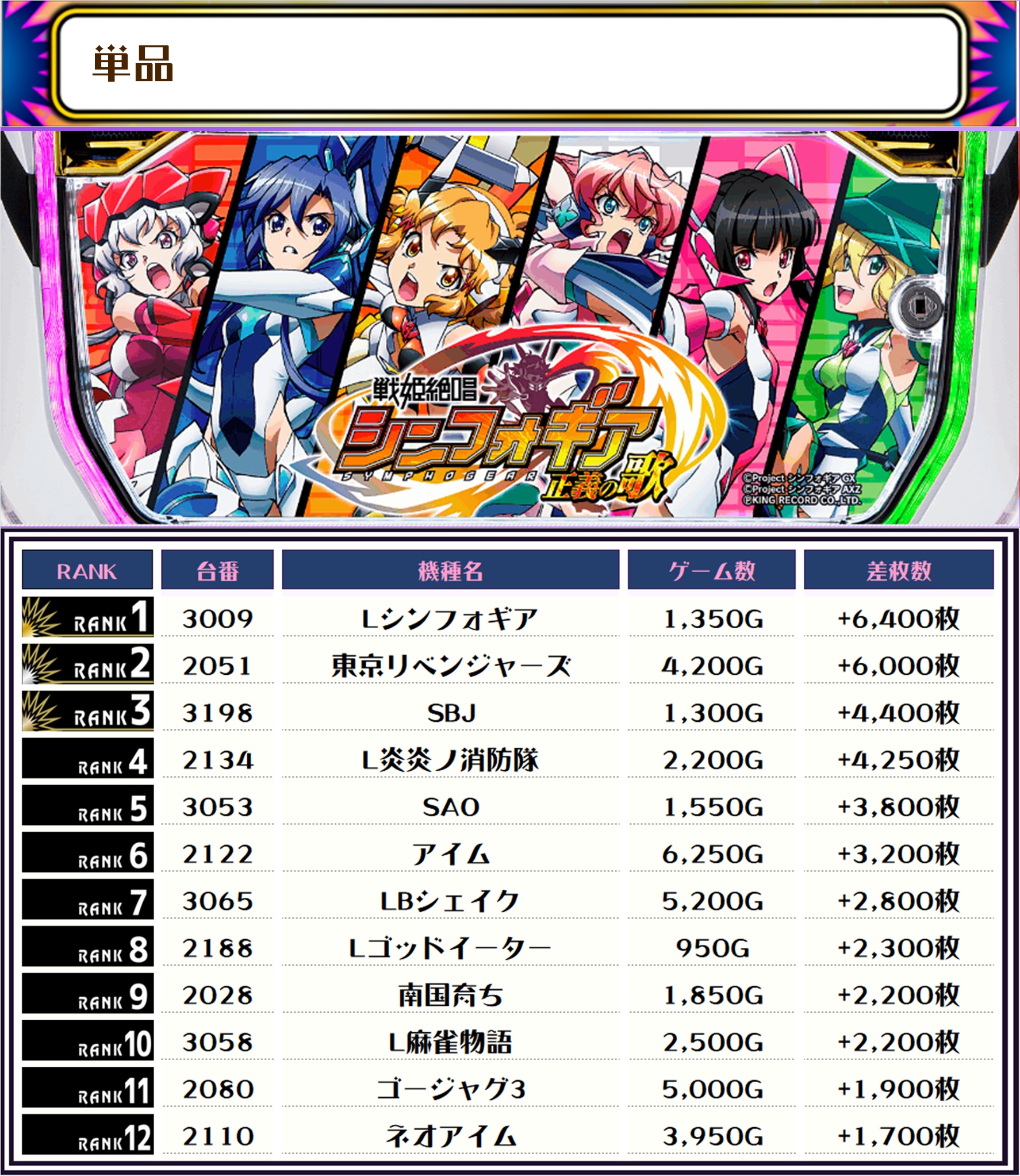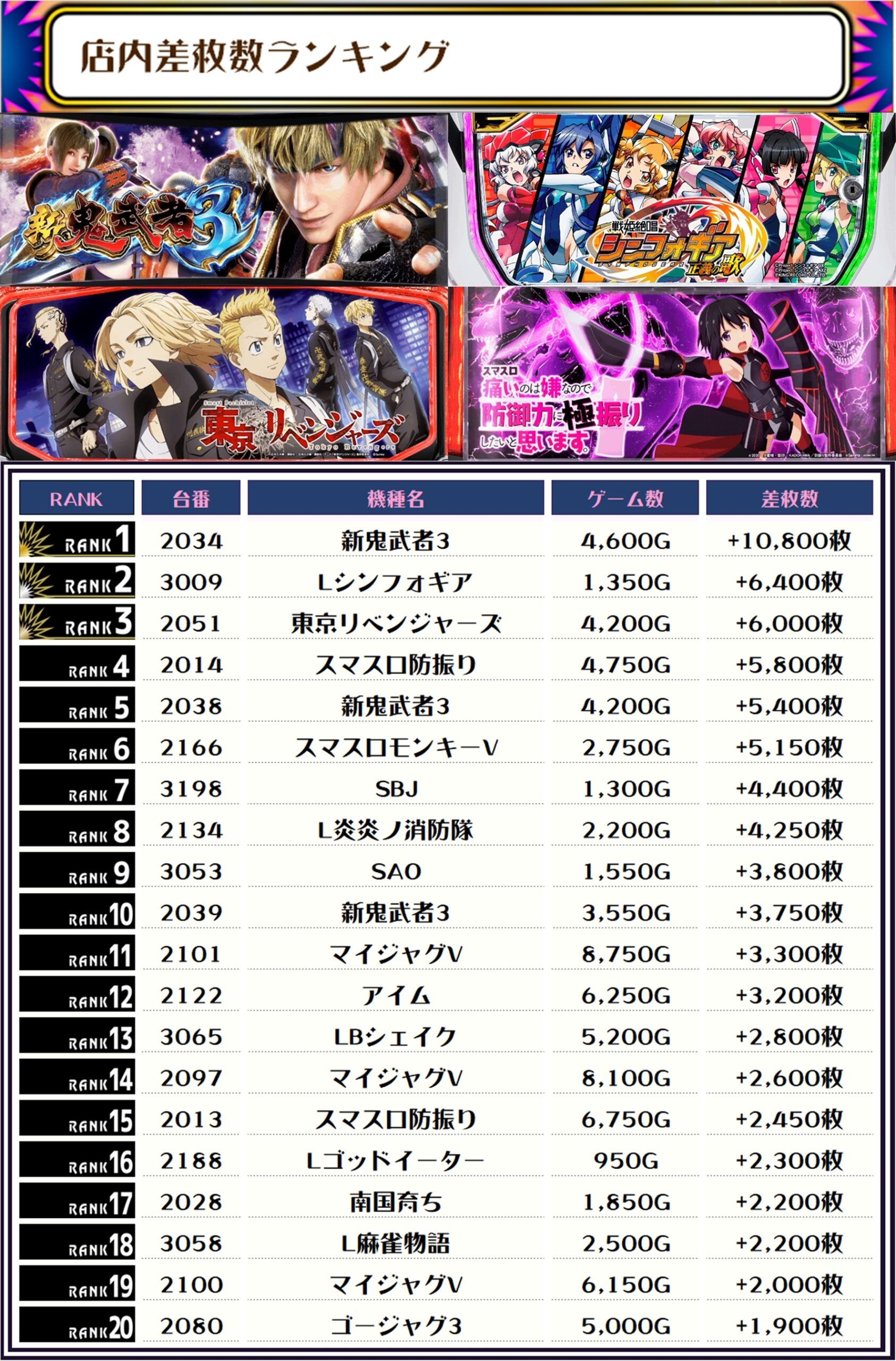 2位には【Lシンフォギア・3009番台】の+6,400枚、3位には【東京リベンジャーズ・2051番台】の+6,000枚がランクインですっ🏆