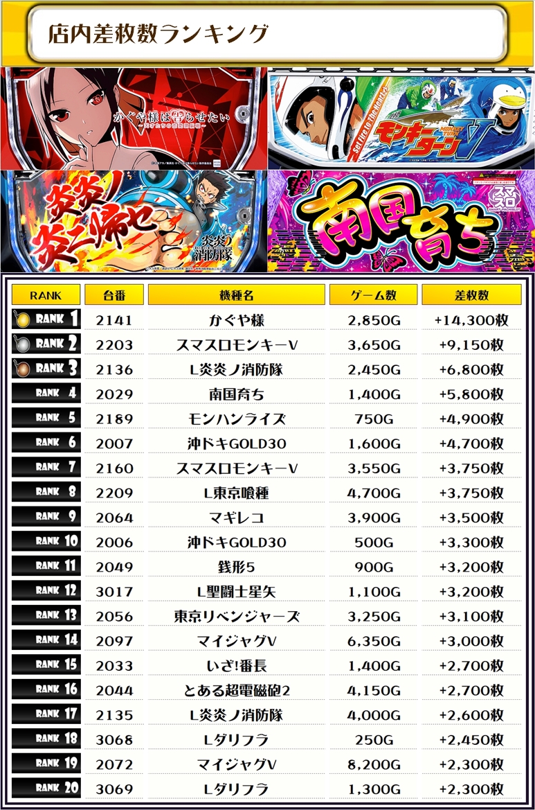 続いて2位には【スマスロモンキーV・2203番台】の+9,150枚、そして3位には【L炎炎ノ消防隊・2136番台】の+6,800枚がランクインですっ🏆
