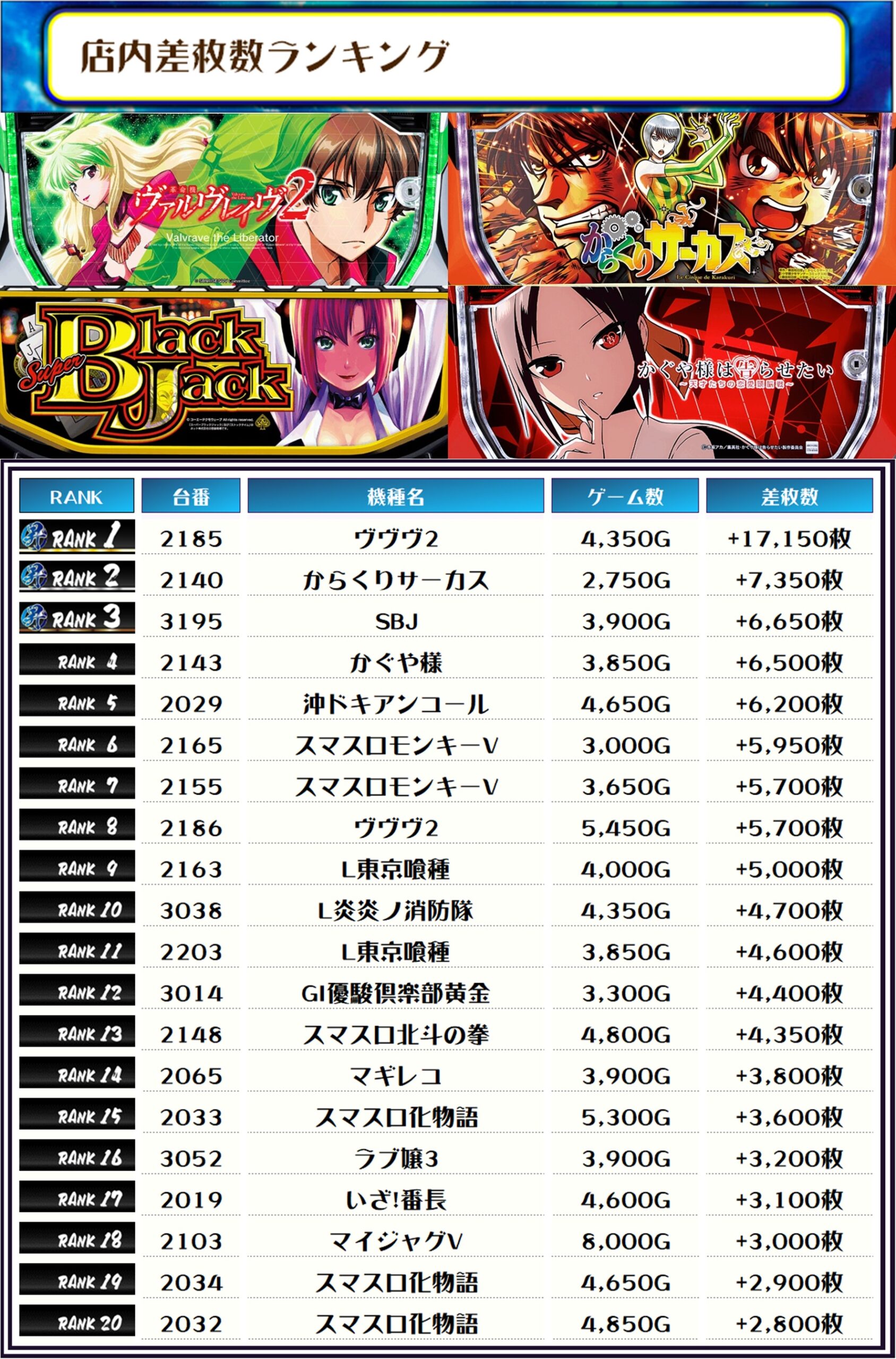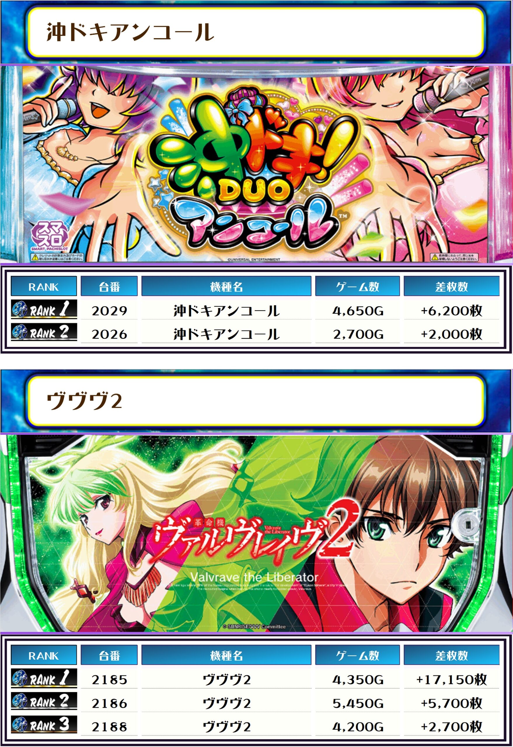 全体のTOP差枚は【ヴヴヴ2・2185番台】で+17,150枚👍