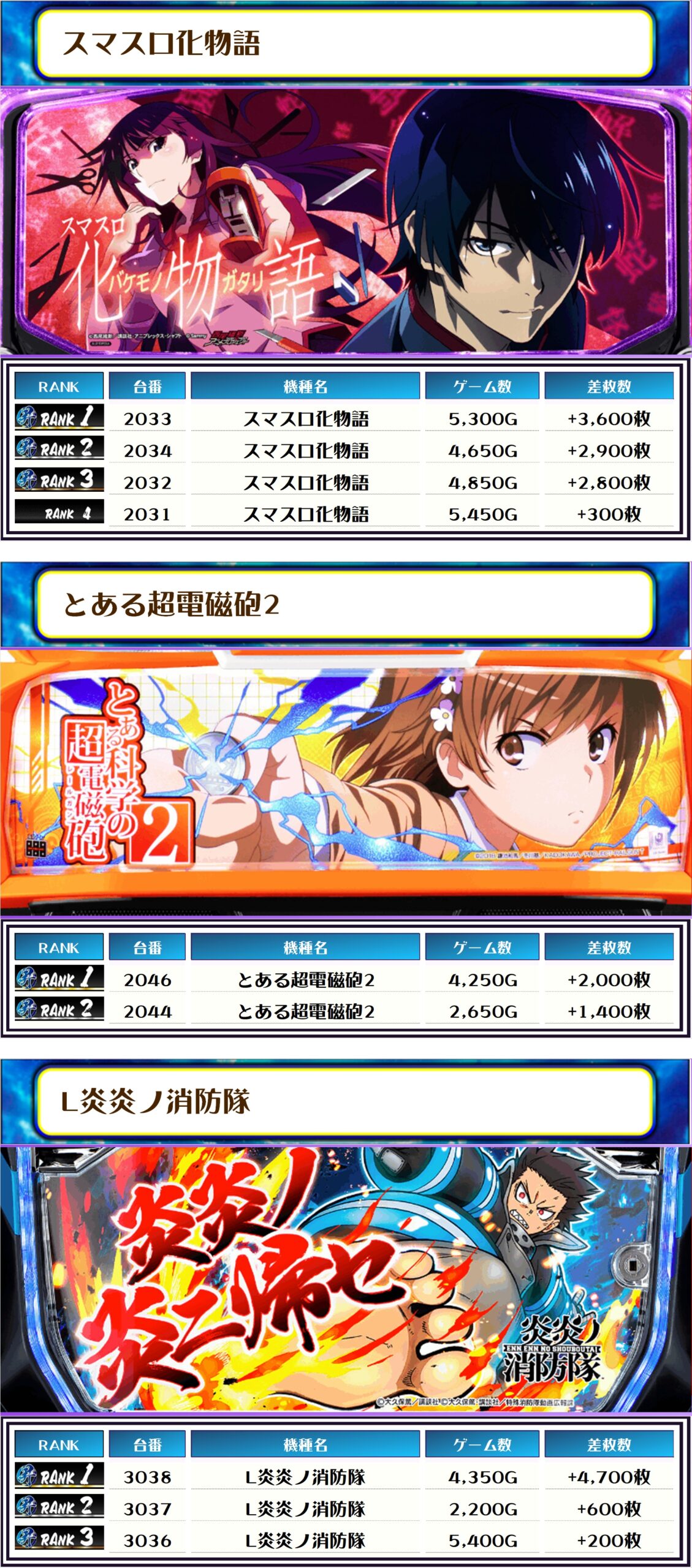 ピックアップした機種では化物語・超電磁砲2・L炎炎ノ消防隊は終始大盛況だったみたいですよ😁