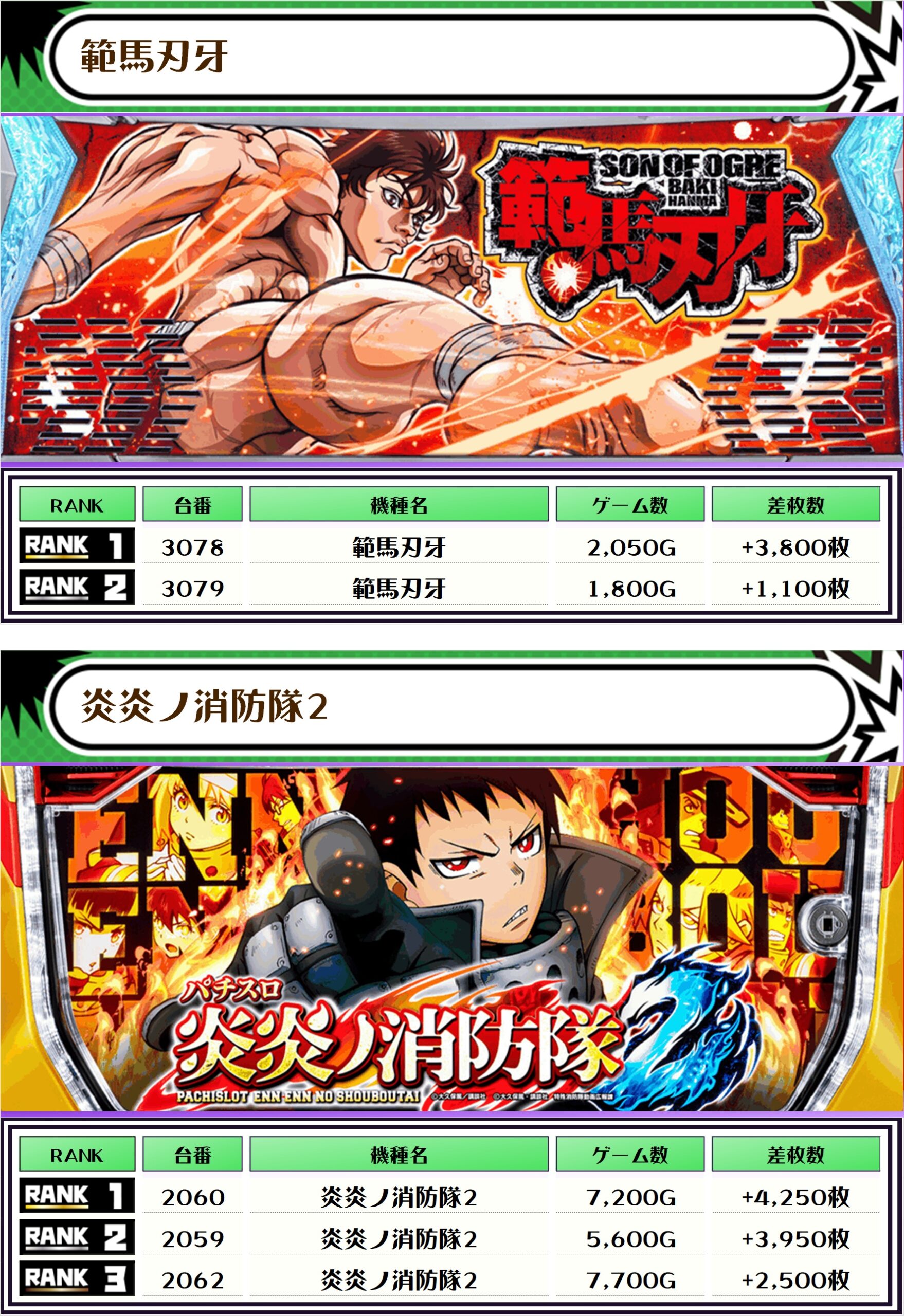 そして、ピックアップのL範馬刃牙・炎炎ノ消防隊2は優秀台が多かったみたいだね👍その他にも単品で優秀台が多数ありましたよ📝