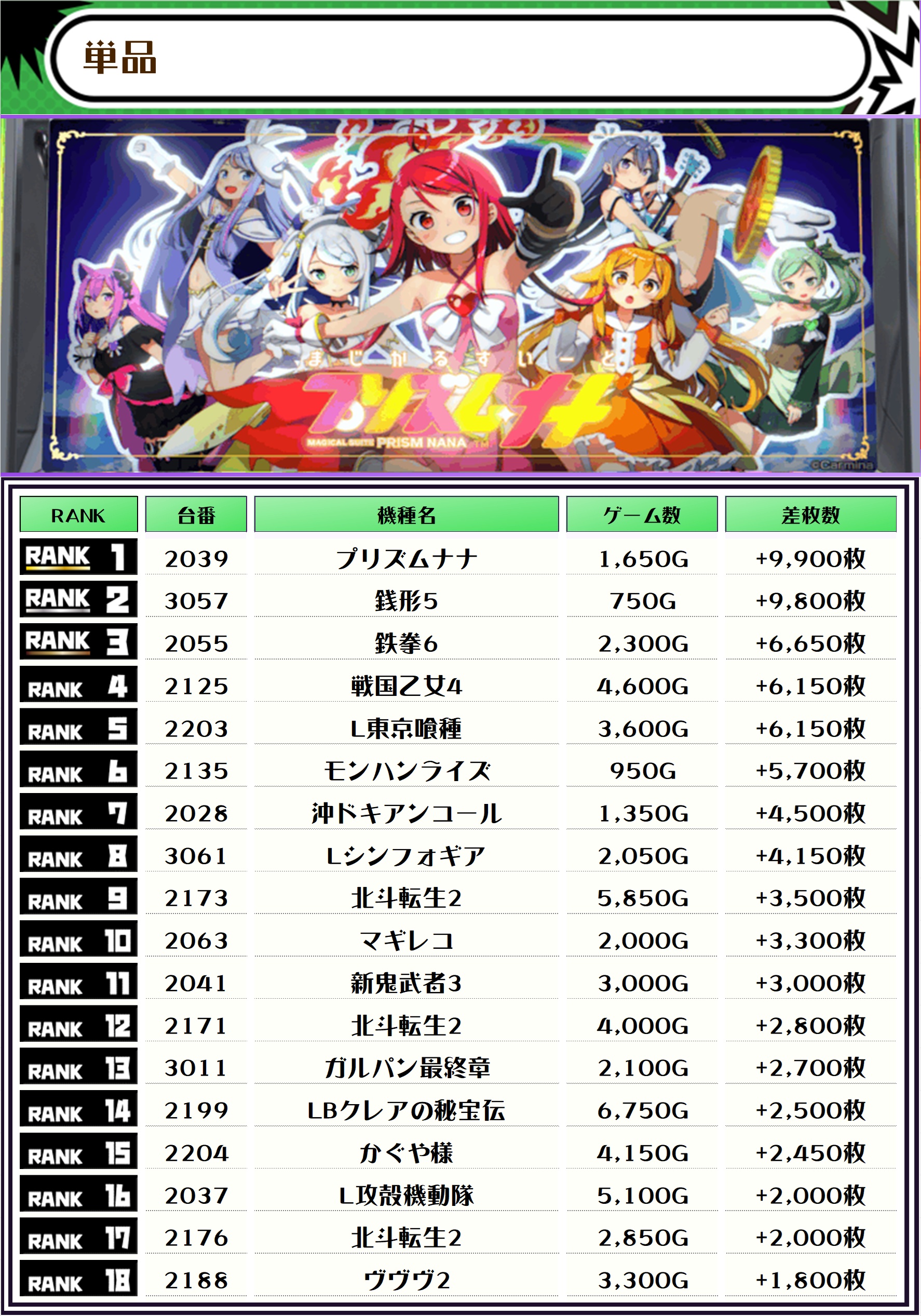 この日、全体の差枚トップに輝いたのは【プリズムナナ・2039番台】で+9,900枚‼️