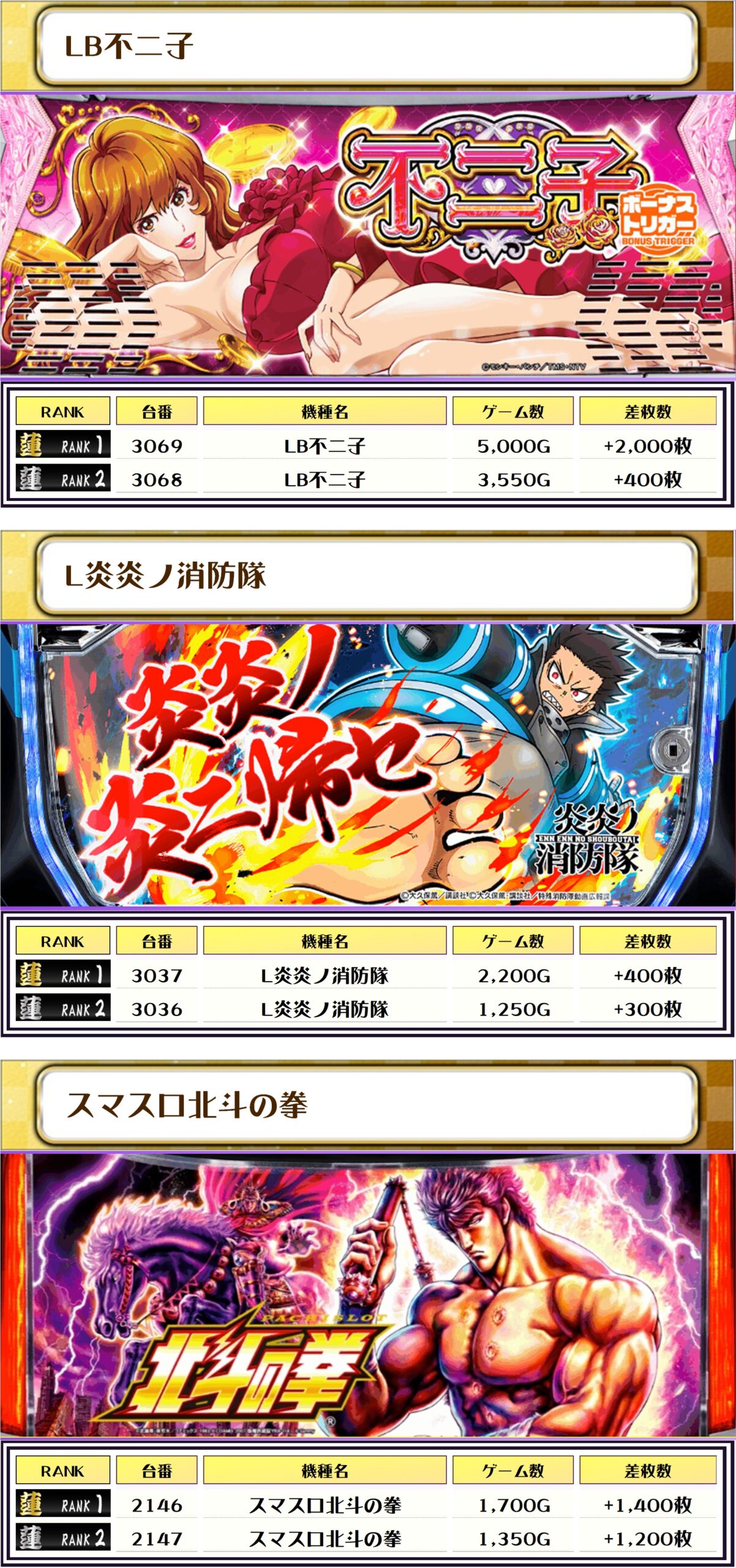 続く2位には【L聖闘士星矢・3054番台】の+6,200枚、そして3位には【北斗転生2・2173番台】の+6,000枚がランクインっ🏆🏆🏆🏆