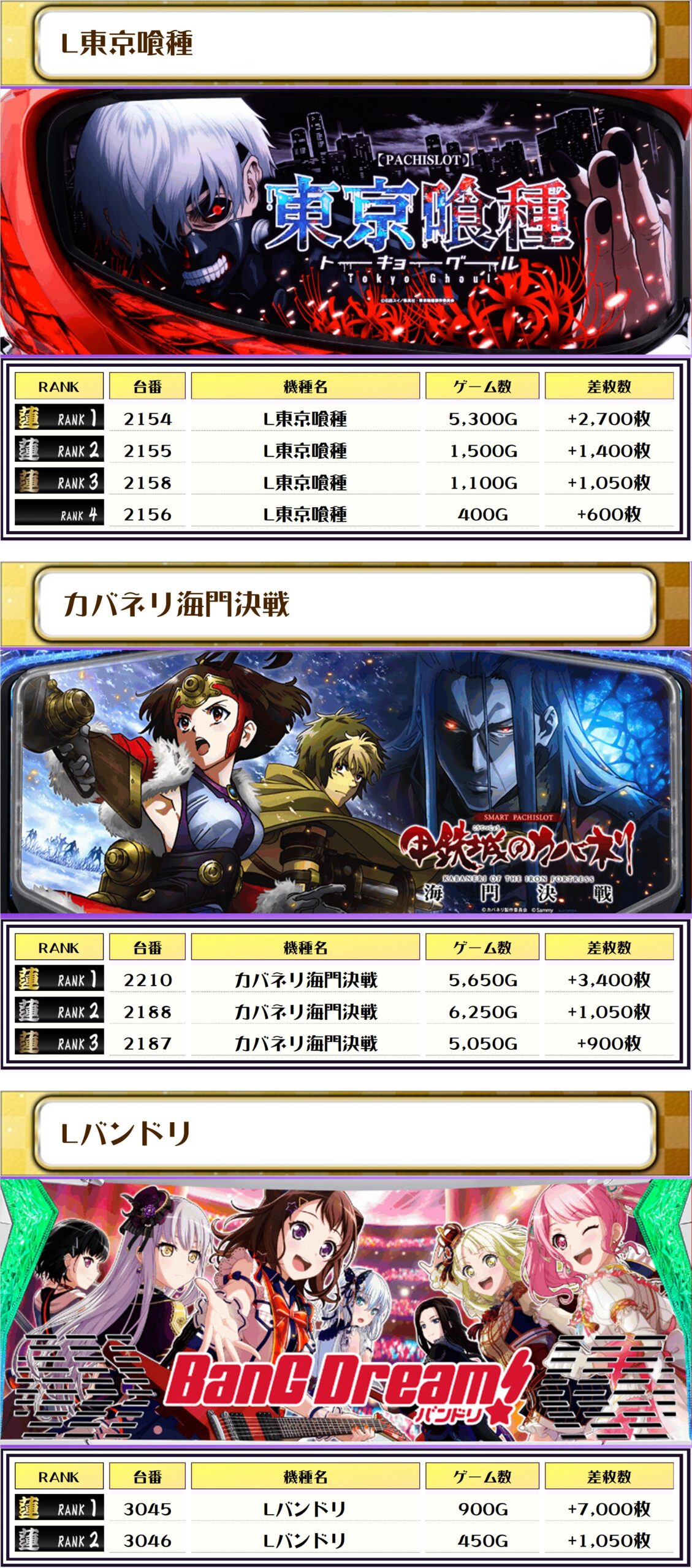 この日、全体の差枚トップに輝いたのは【Lバンドリ・3045番台】で+7,000枚‼️