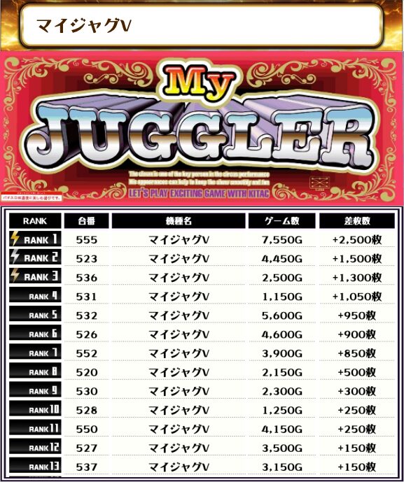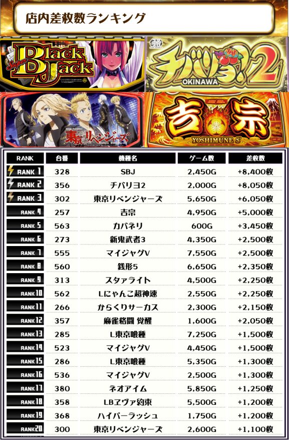 続いては「店内全台の差枚ランキング」をご覧ください!