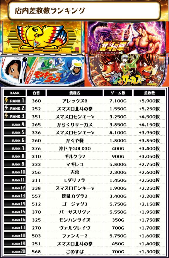 続いては「店内全台の差枚ランキング」をご覧ください!