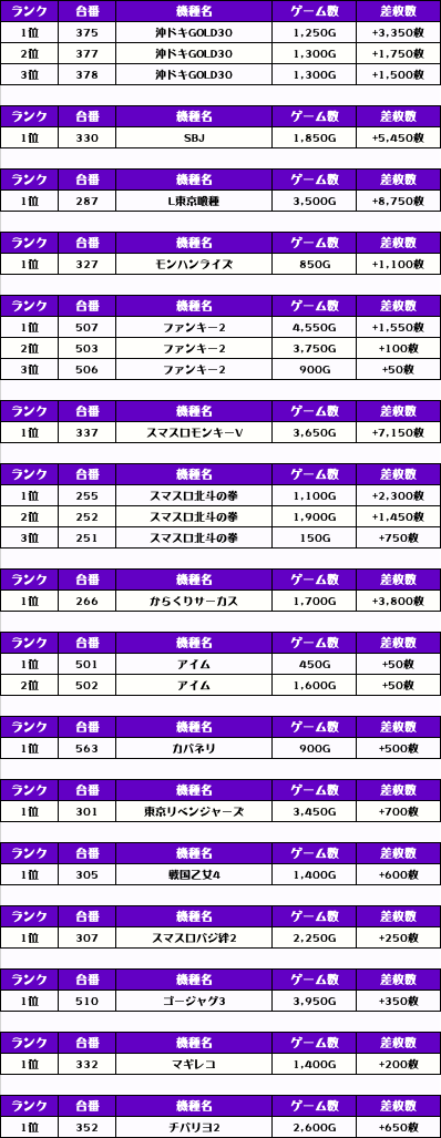 その他の機種別差枚ランキングはこちらから!