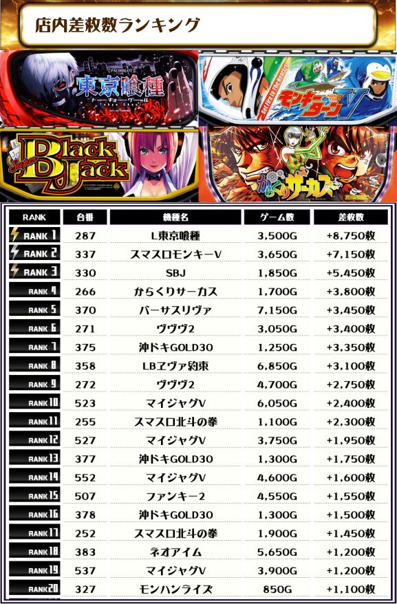 続いては「店内全台の差枚ランキング」をご覧ください!