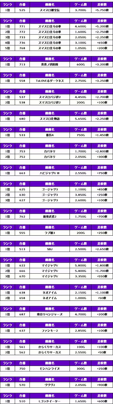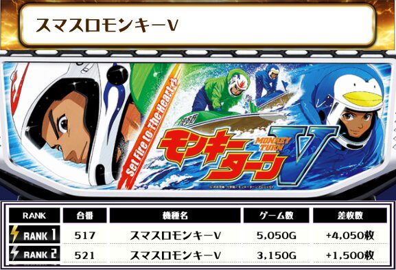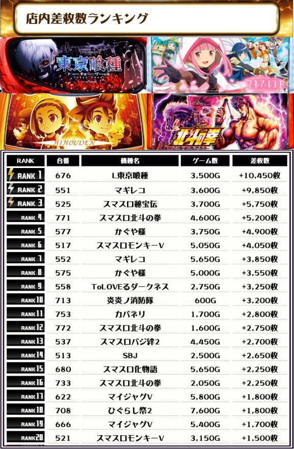 続いては【店内全台の差枚ランキング】をご覧ください!