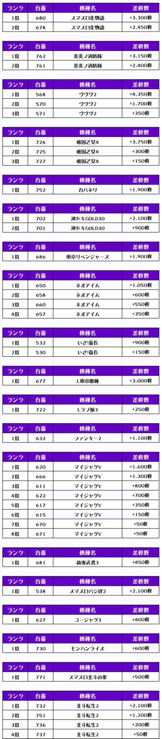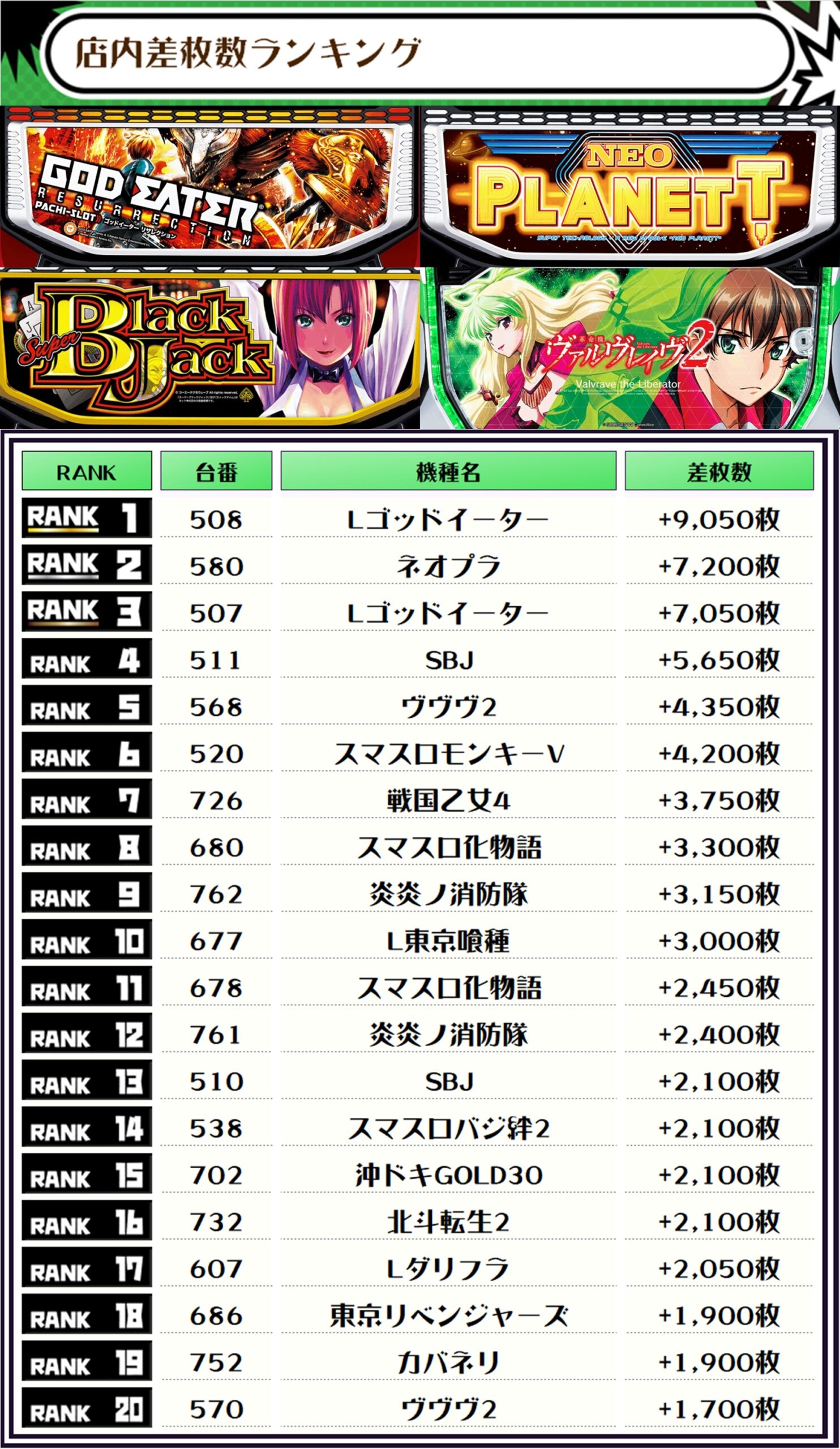 それでは、この日の【機種別差枚ランキング】を見ていきましょう❗️