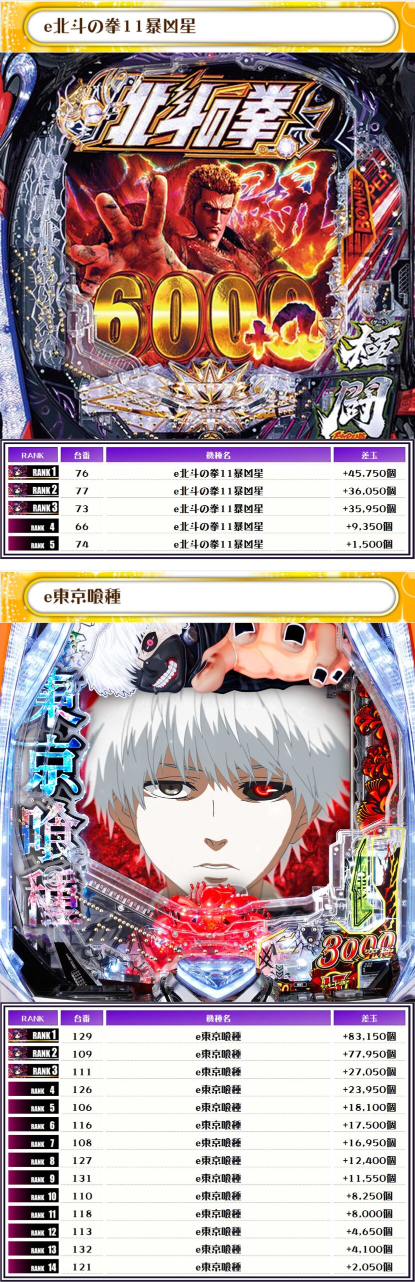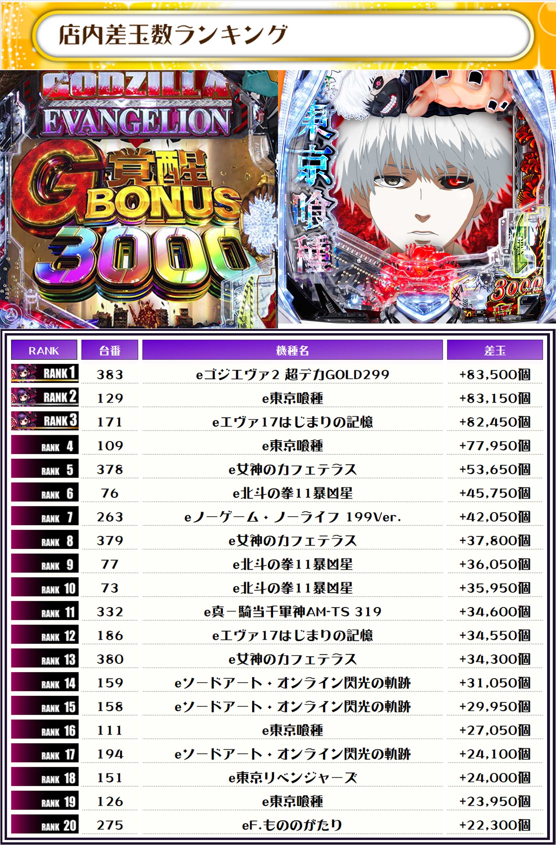 続く2位には【e東京喰種・129番台】の+83,150発、そして3位には【eエヴァ17はじまりの記憶・171番台】の+82,450発がランクイン~✨