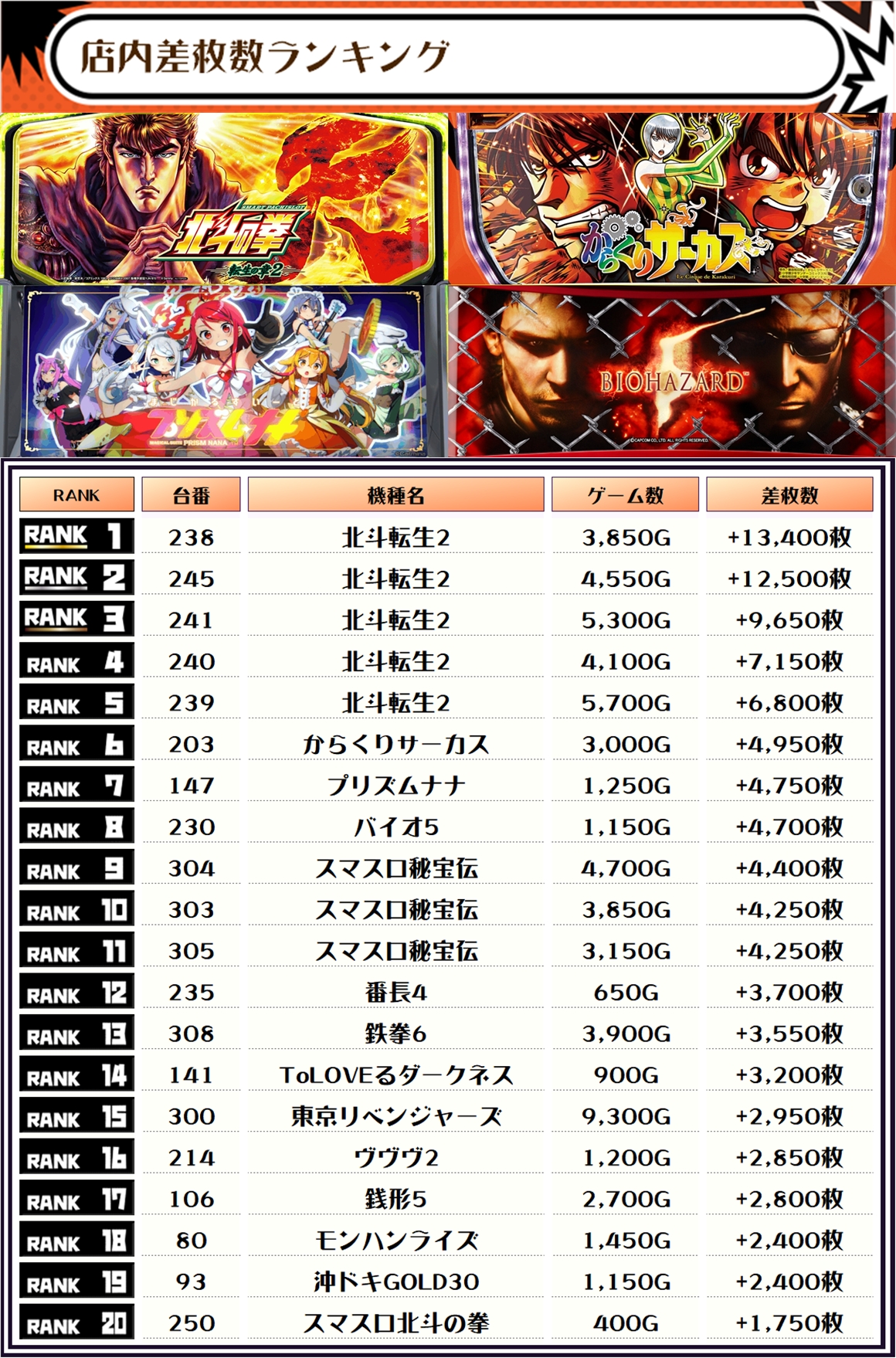 2位も同じく【北斗転生2・245番台】の+12,500枚、そして3位にもまたまた同じく【北斗転生2・241番台】の+9,650枚がランクインです‼️💥💥💥💥💥