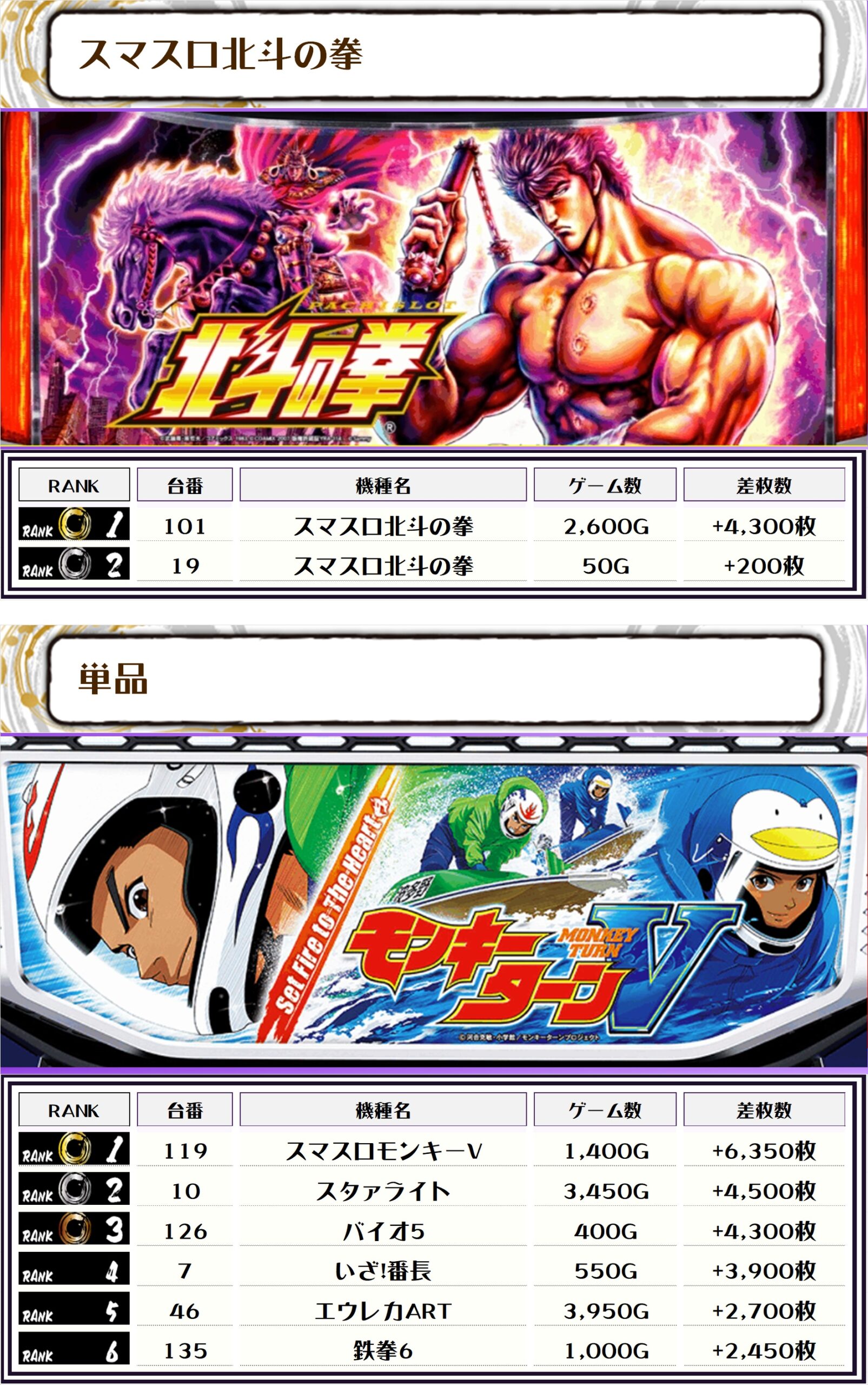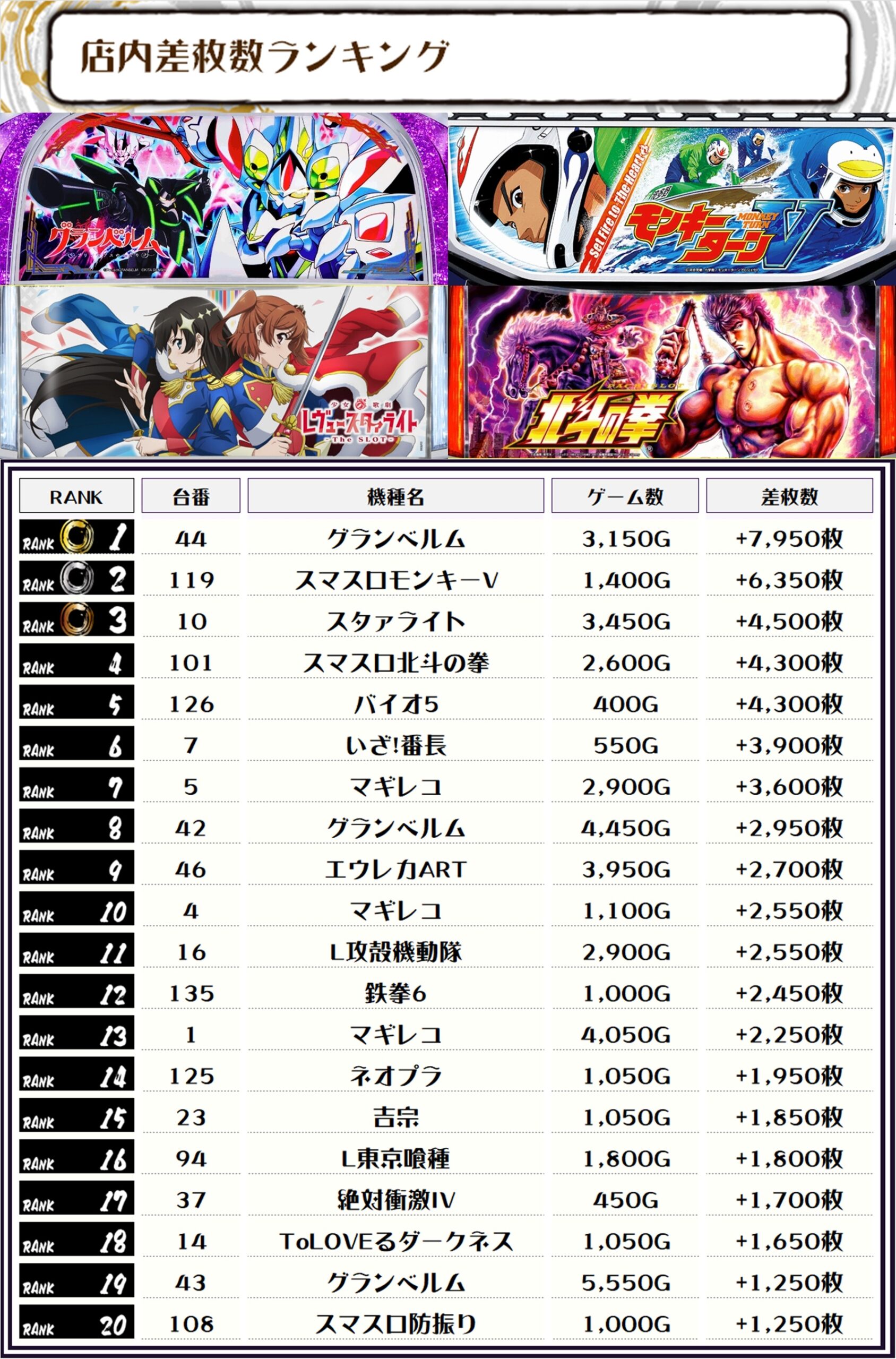 2位にはスマスロモンキーV・119番台】の+6,350枚、そして3位には【スタァライト・10番台】の+4,500枚がランクインっ🏆🏆🏆🏆