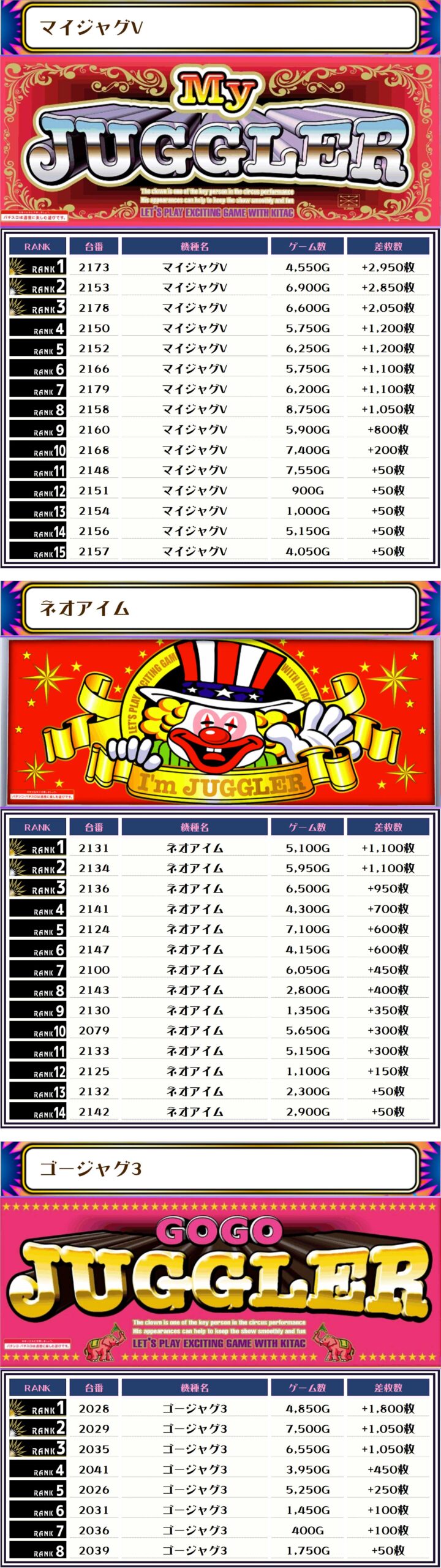今回はジャグラーシリーズの稼働が非常に目立っていて、ピックアップした3機種は際立つ形に👍優秀台が多かったことは間違いなさそうです🤔