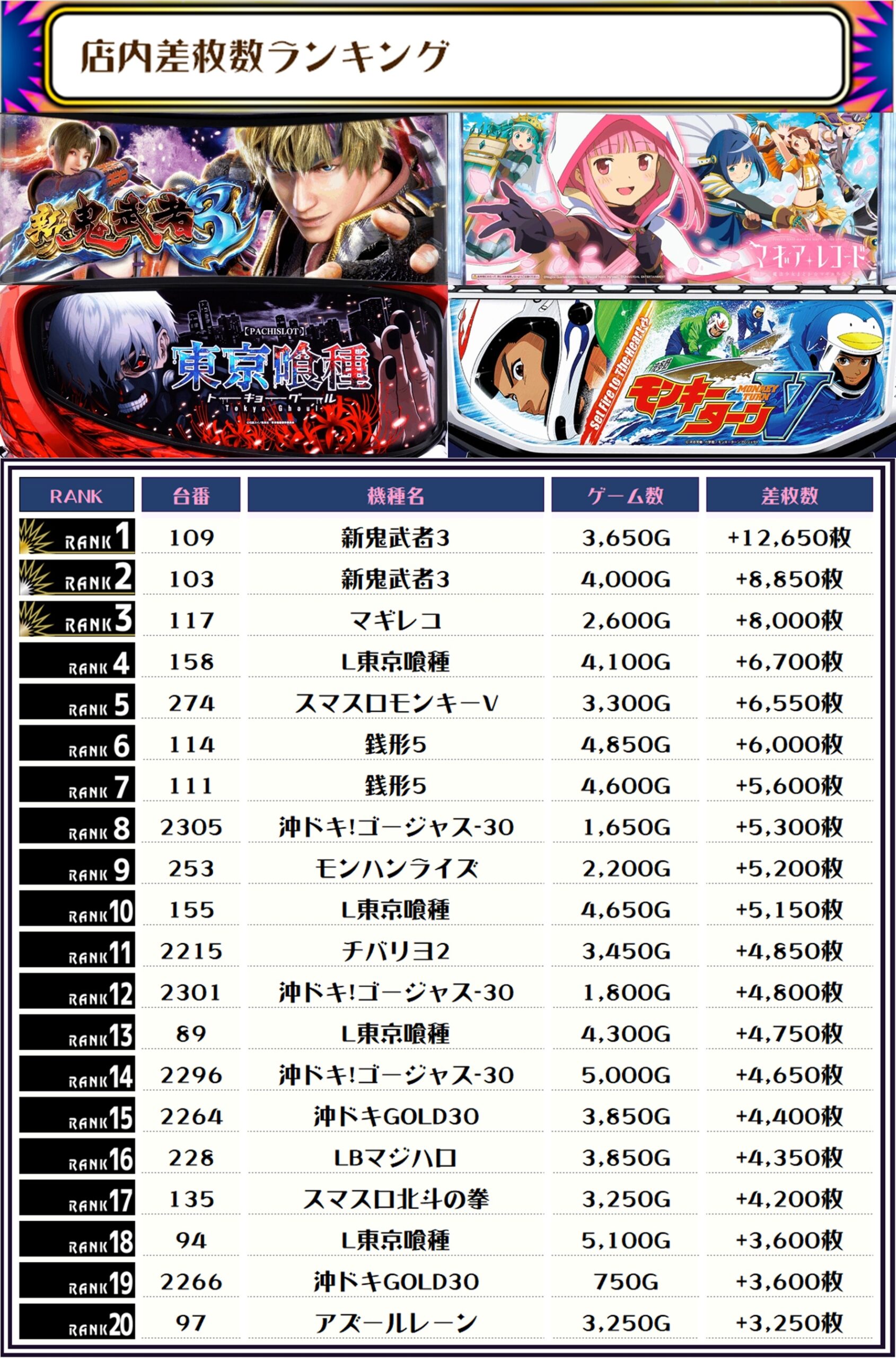 それではこの日の【機種別差枚ランキング】を見ていきましょう💪