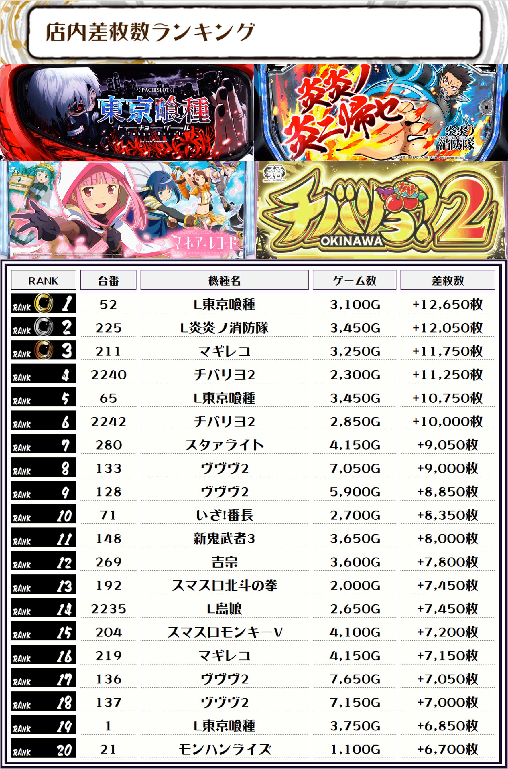 2位には【L炎炎ノ消防隊・225番台】の+12,050枚、そして3位には【マギレコ・211番台】の+11,750枚がランクインっ🏆🏆🏆🏆