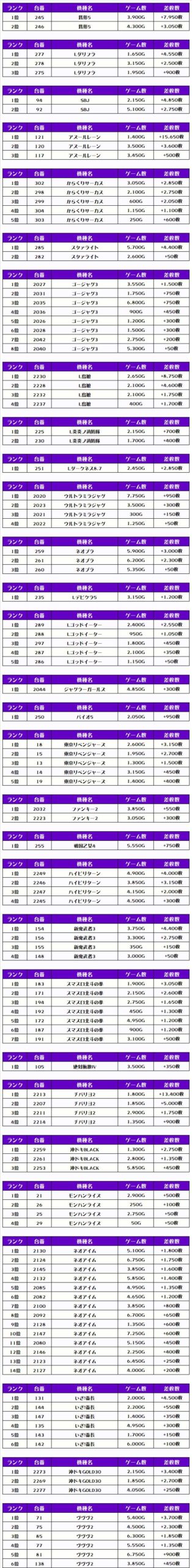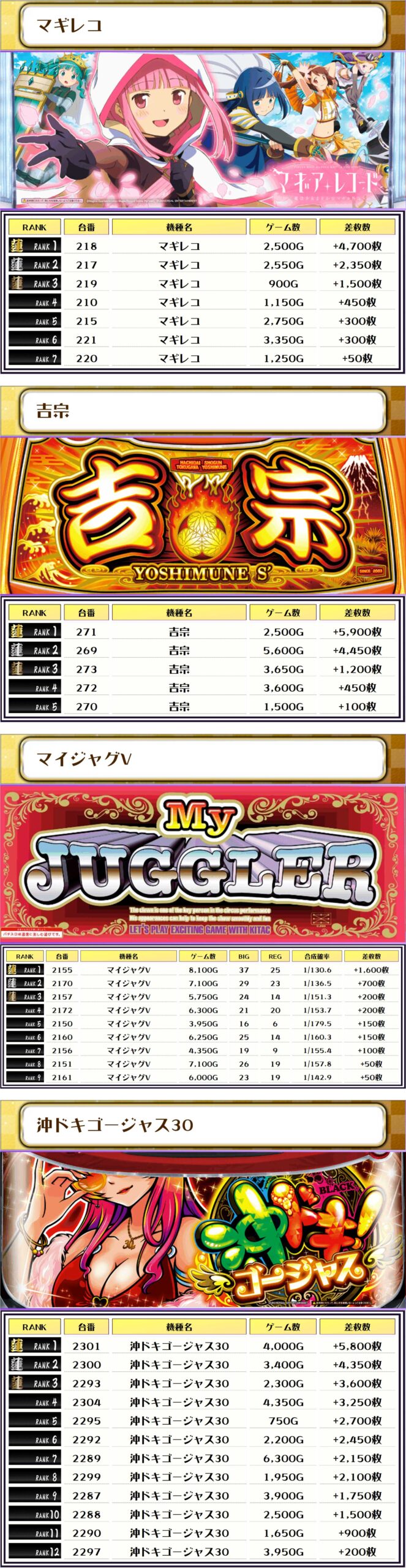 次にこの日の【機種別差枚ランキング】を見ていきましょう💪