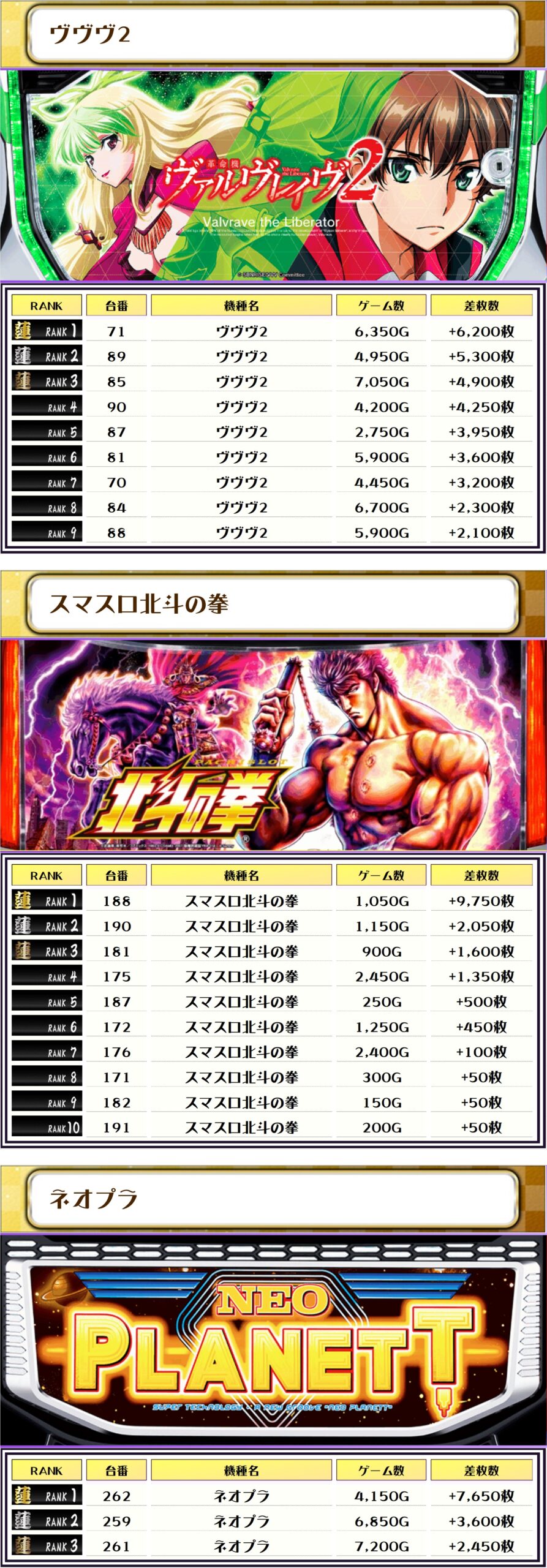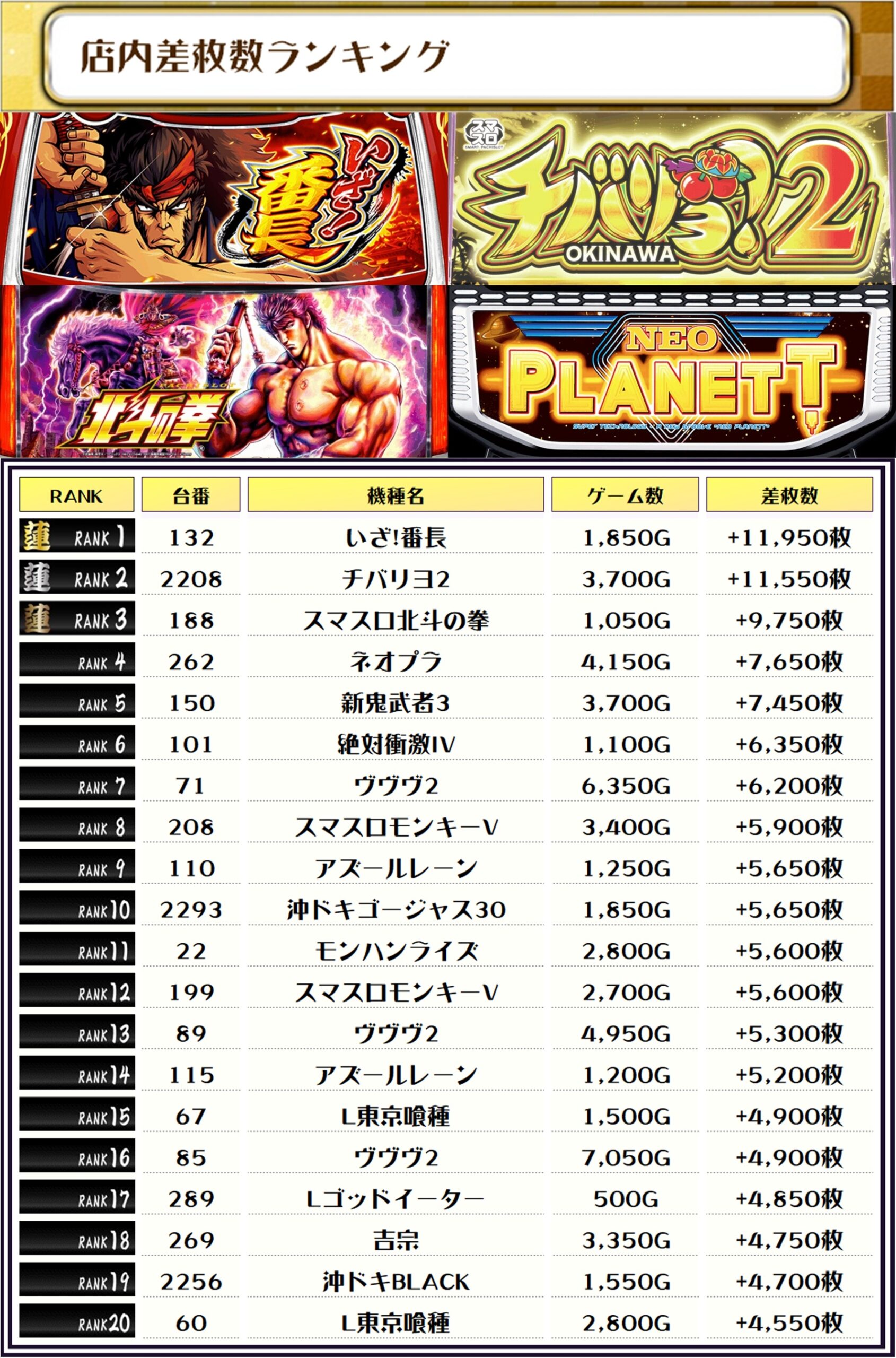 2位には【チバリヨ2・2208番台】の+11,550枚、そして3位には【スマスロ北斗の拳・188番台】の+9,750枚がランクインしましたーっ🏆