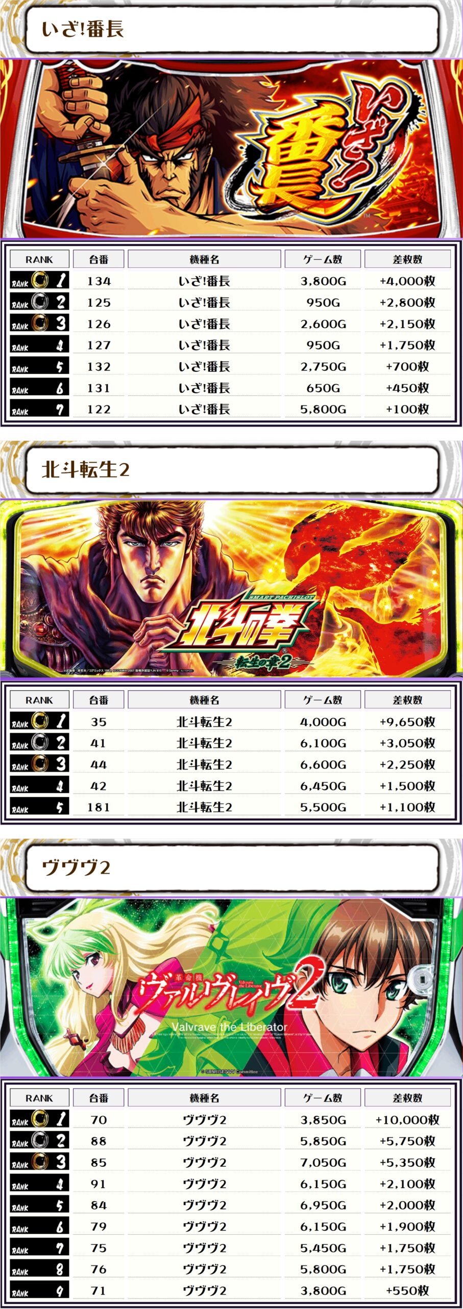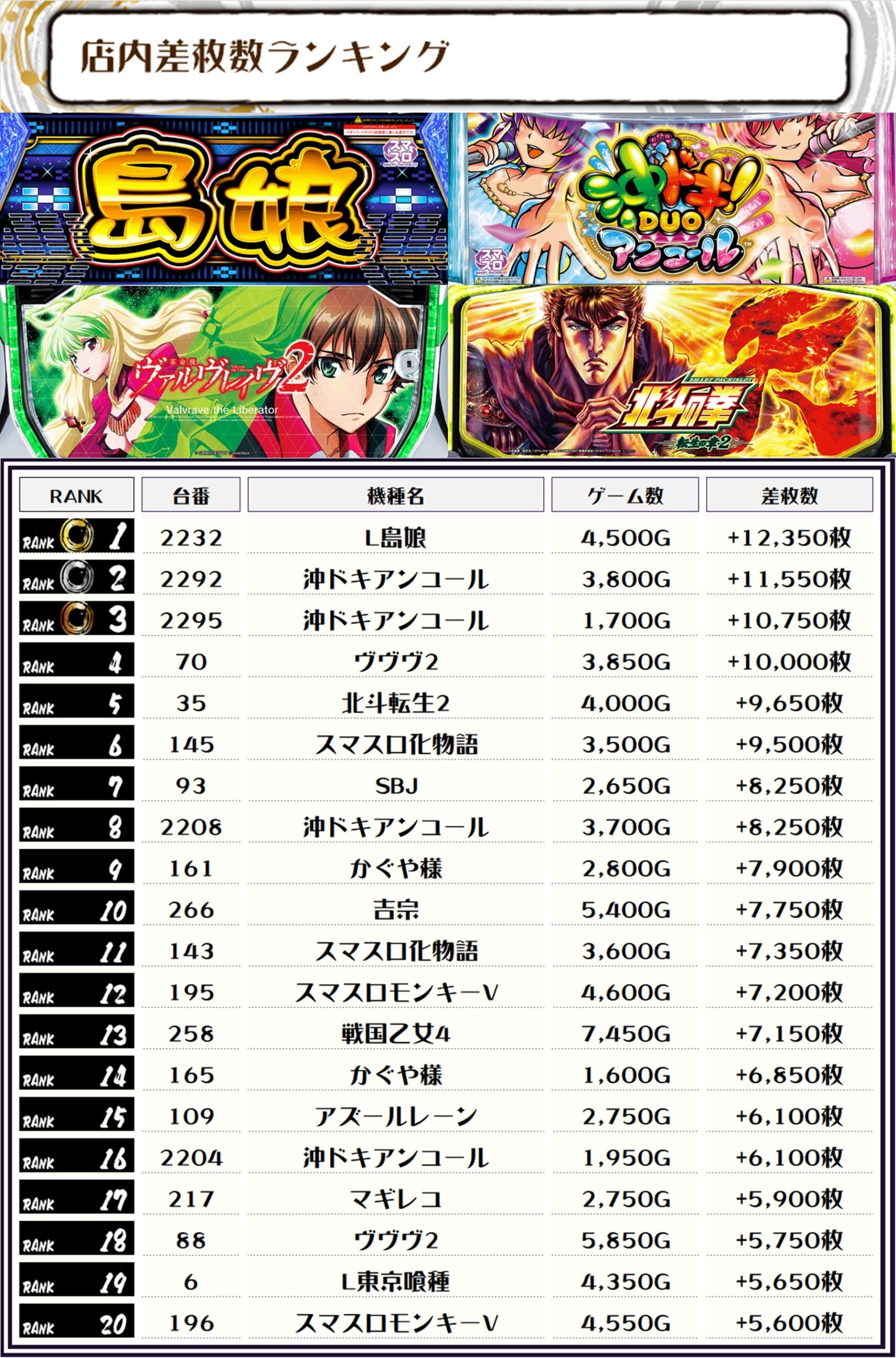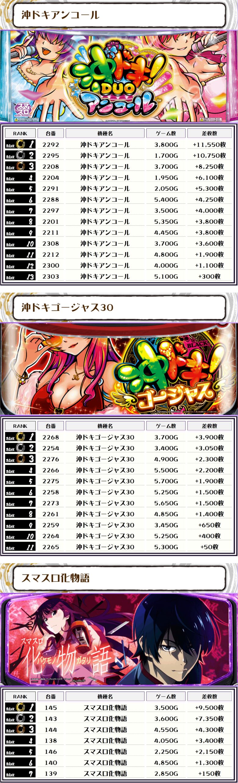 2位には【冲ドキアンコール・2292番台】の+11,550枚、そして3位にも同じく【冲ドキアンコール・2295番台】の+10,750枚がランクインっ🏆🏆🏆🏆