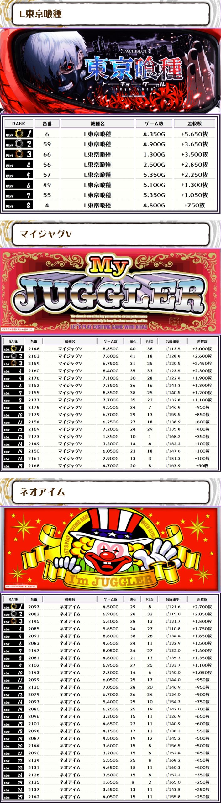 ジャグ系の稼働も全体的に非常に高く、中でもマイジャグV・ネオアイムは常に大盛況だったみたいです👌