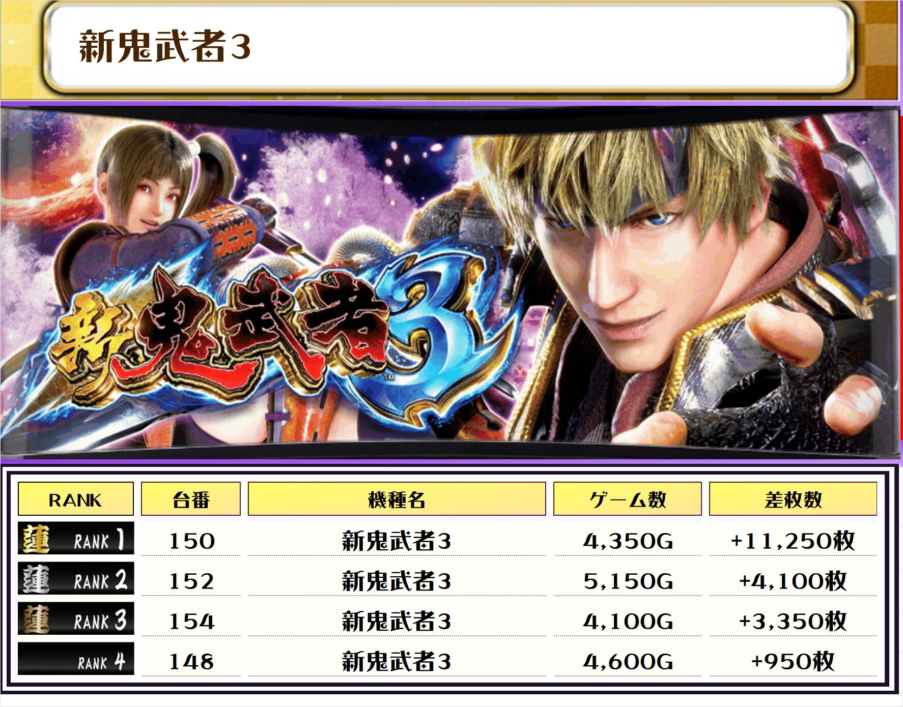 この日、差枚トップに輝いたのは【新鬼武者3・150番台】で+11,250枚‼️